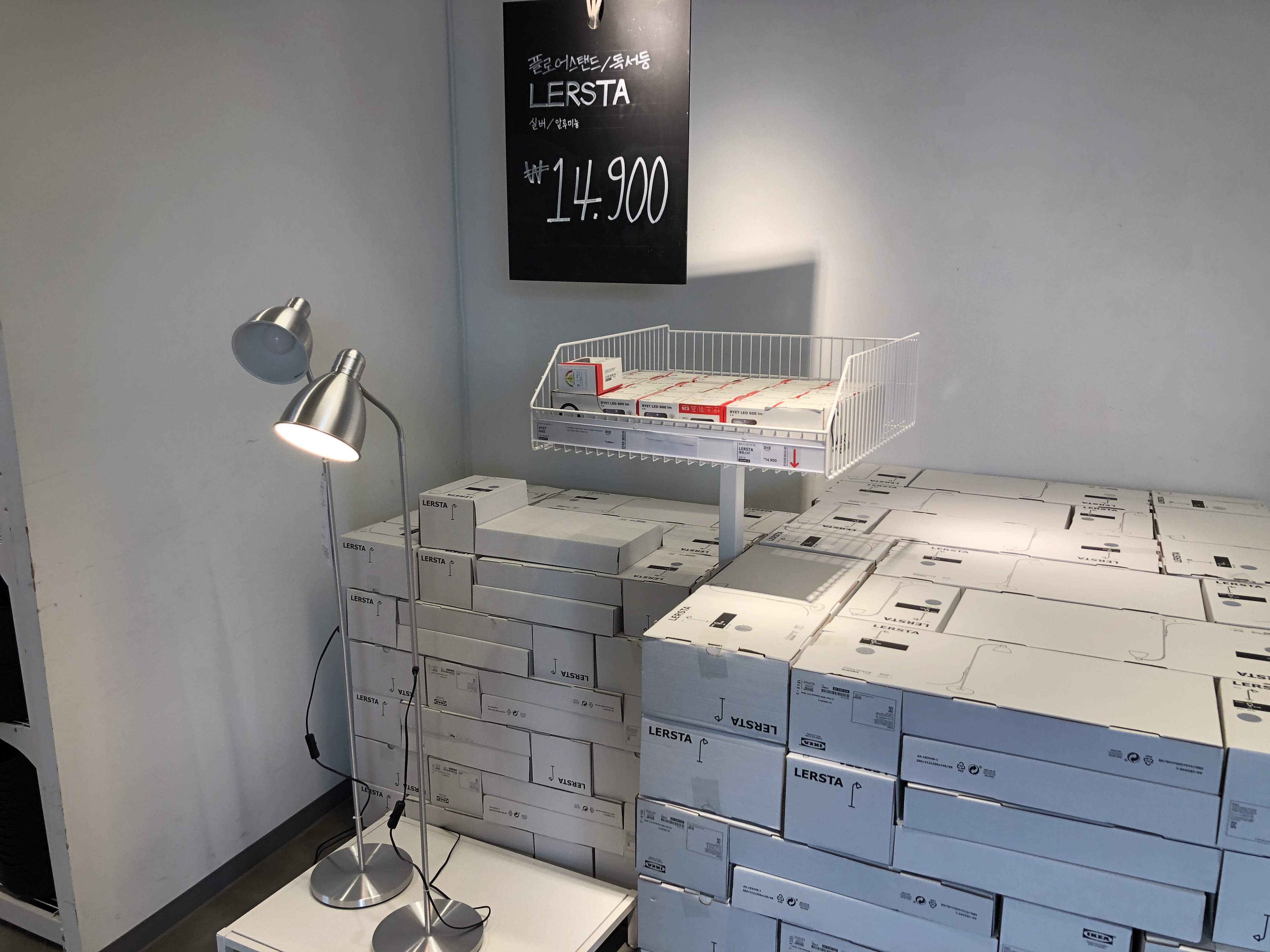 이케아에서 너무 저렴해서 구매할 수밖에 없었던 제품. LERSTA 레르스타 플로어 스탠드 (알루미늄 독서등). 지나가다 14,900원이라는 가격을 보고 너무 저렴해서 바로 카트에 담아버렸네요. 이 제품은 인기 있는 상품이라 그런지 사람들이 많이 지나가는 길목을 차지하고 있었습니다.