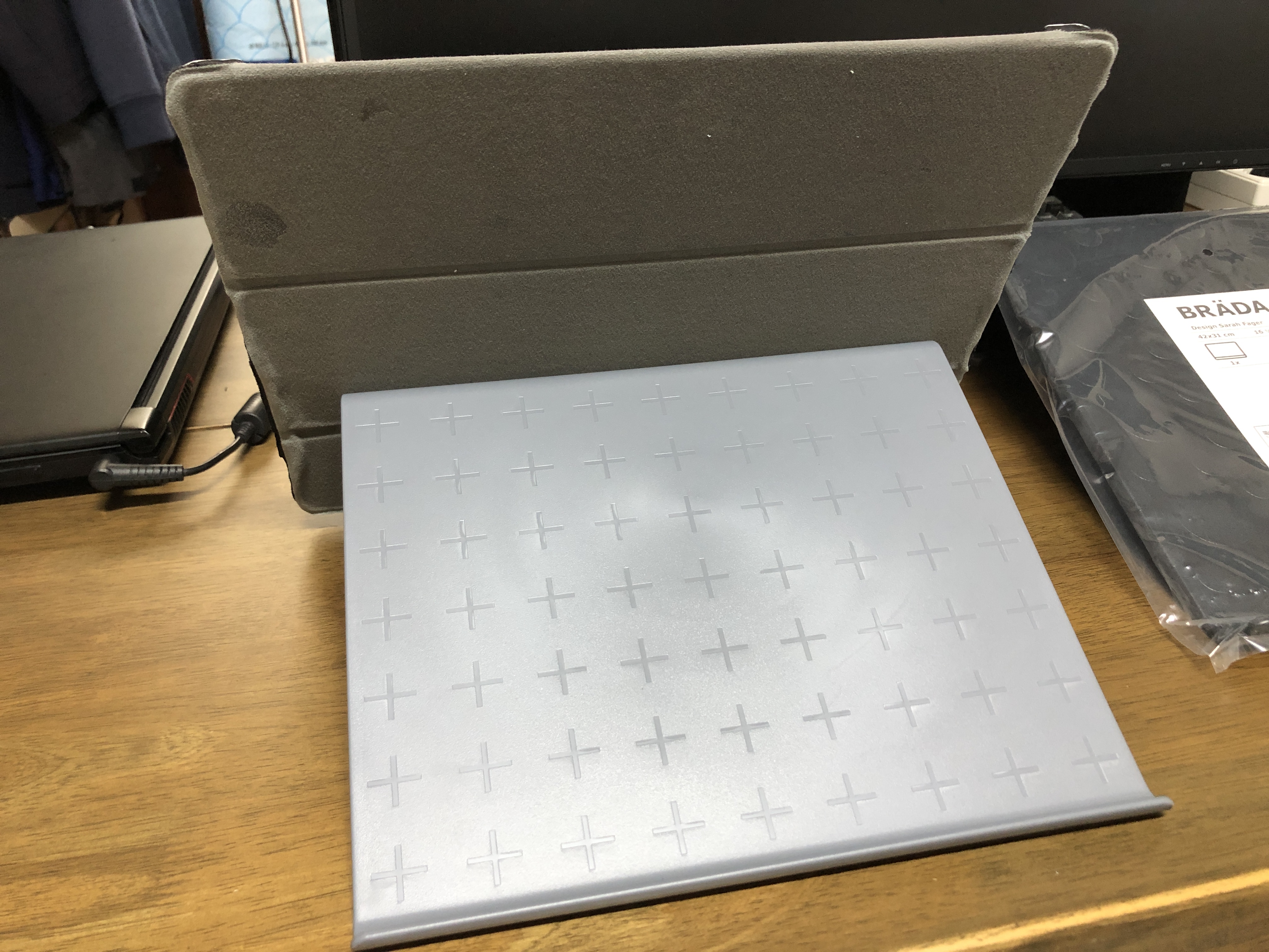 이케아에서 비슷한 두 제품을 구매했습니다. 하나는 ISBERGET 이스베리에트 태블릿 거치대, 하나는 BRADA 브레다 노트북 받침대입니다. 가격은 각각 2500원, 4900원입니다.