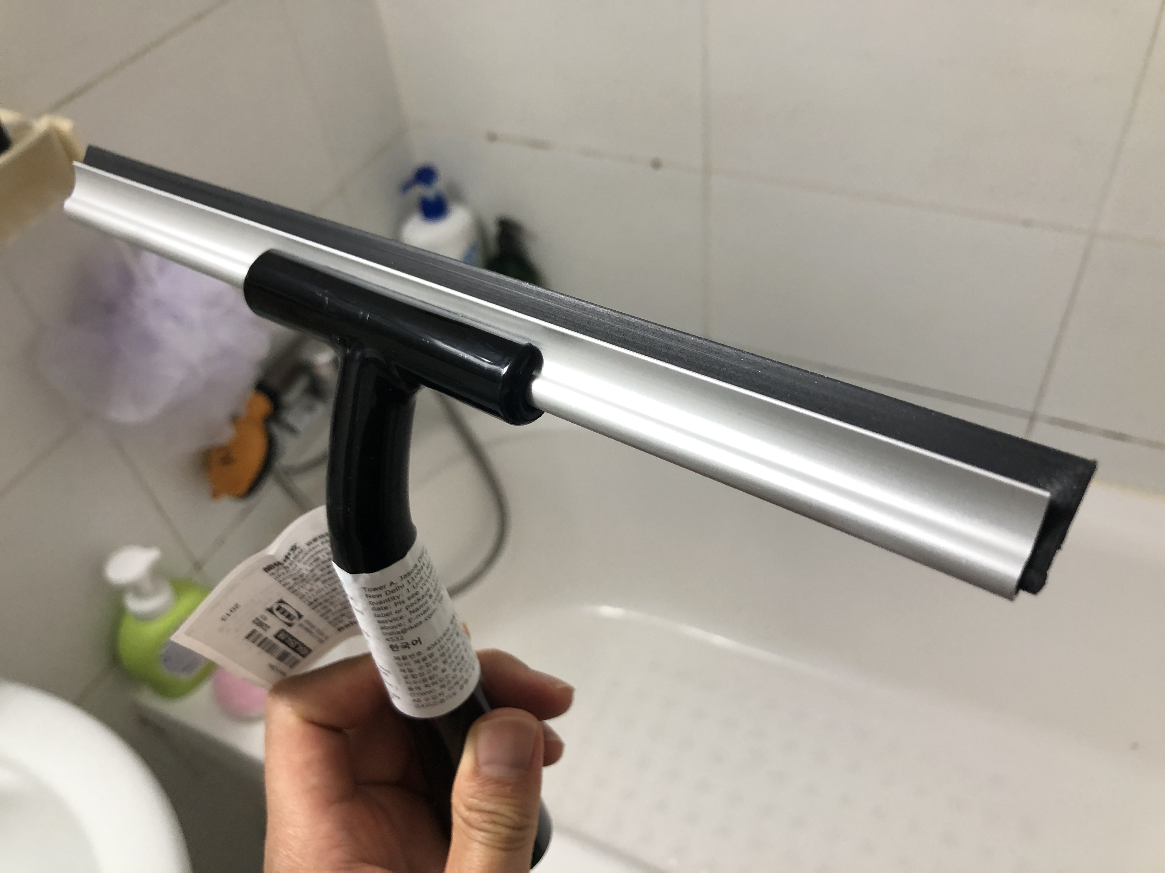 샤워를 하고 이케아 유리닦이로 화장실 벽면, 유리, 바닥을 닦으면 좋습니다. 위에서 아래도 닦아야지 반대로하다가는 욕조같은 플라스틱으로 된 부분이 손상될 수 있으니 참고하세요.
