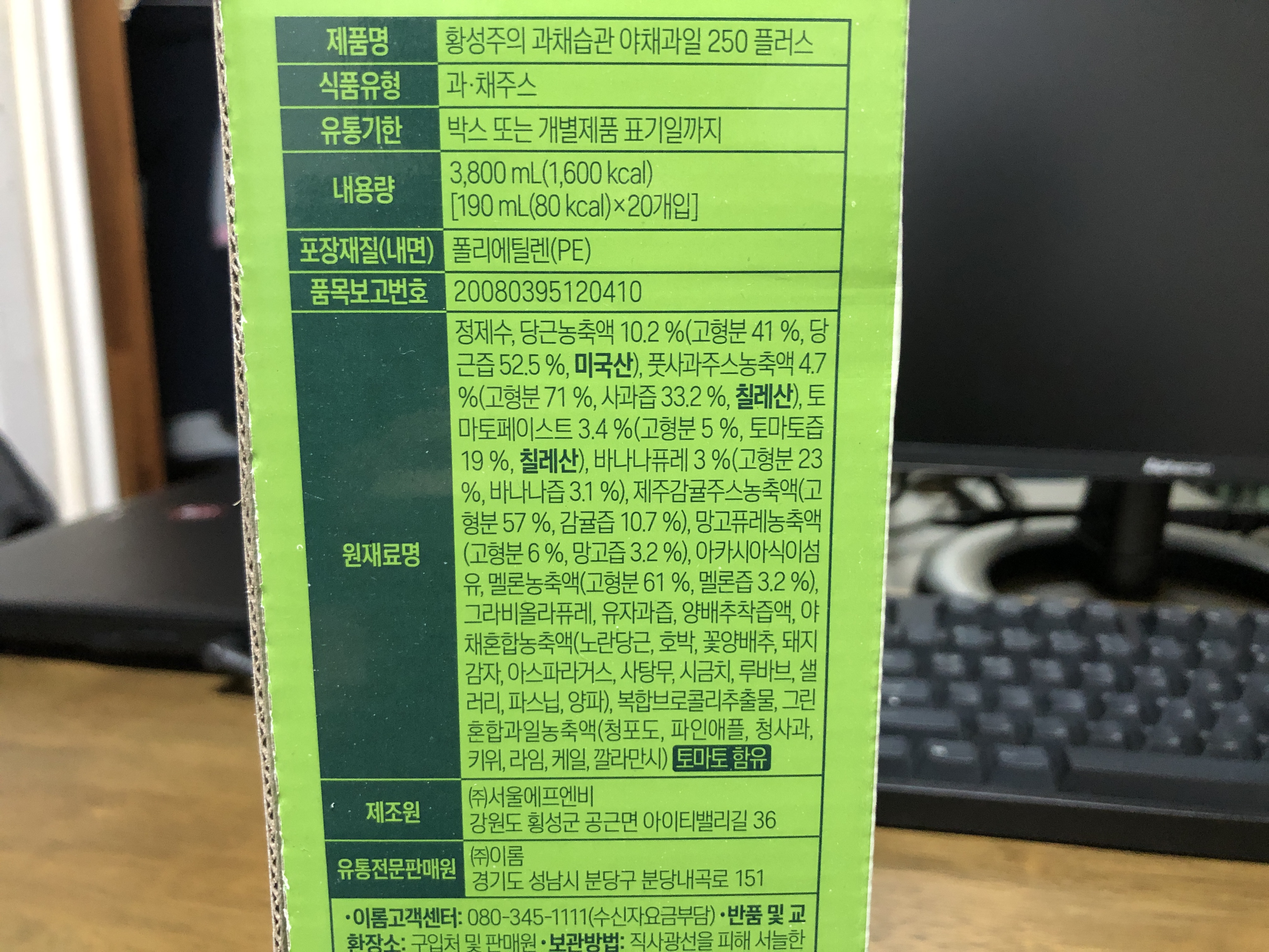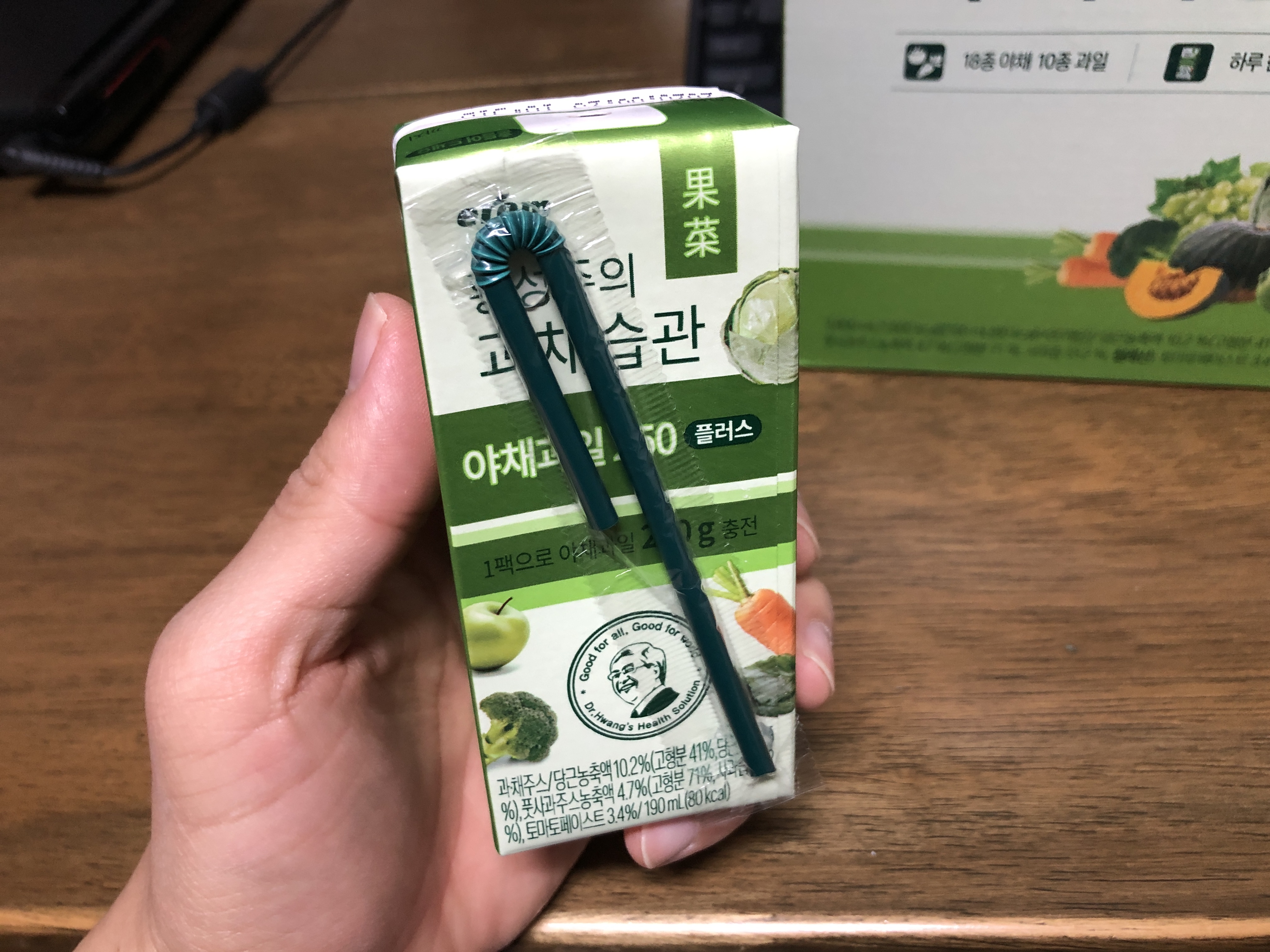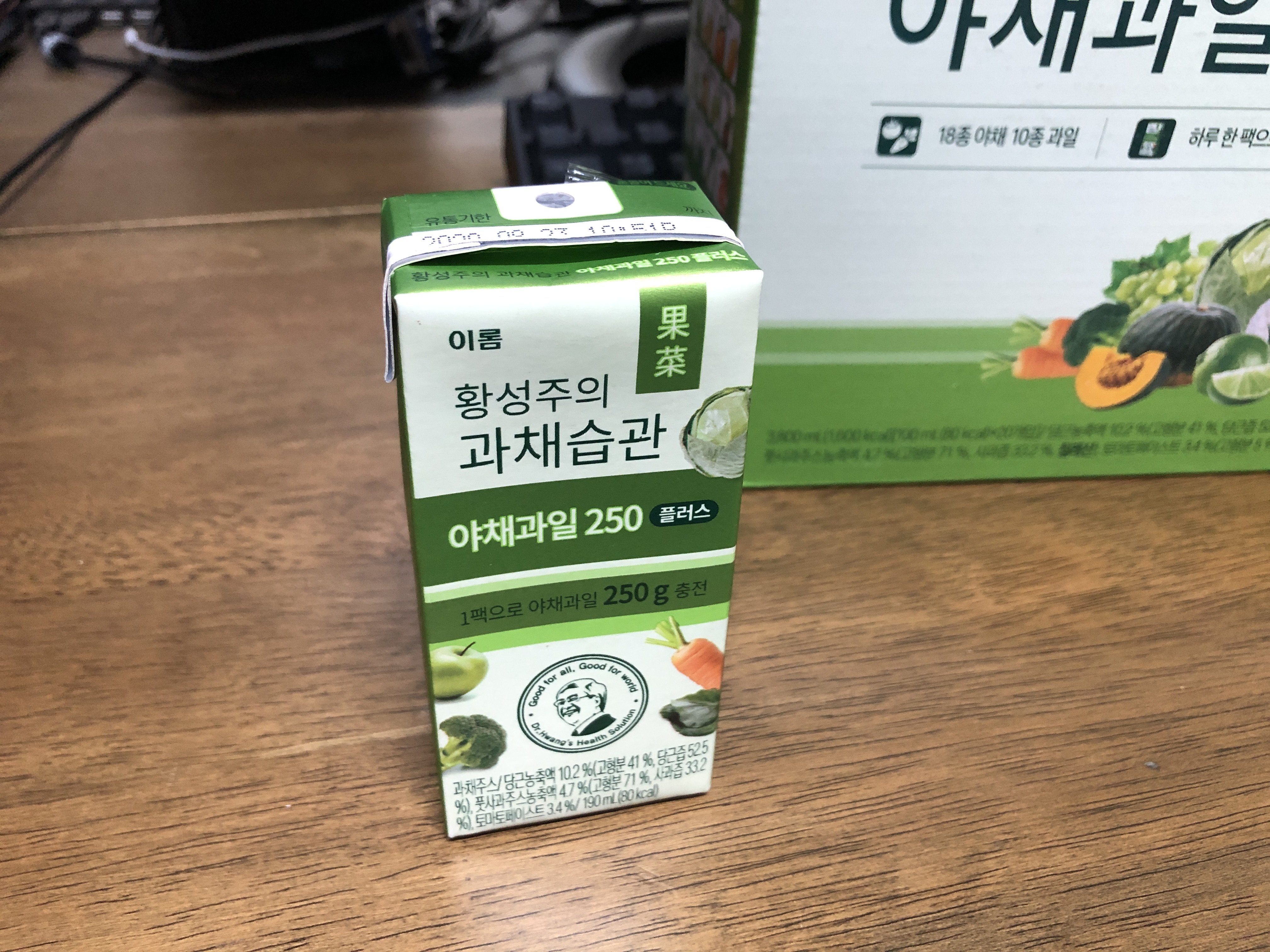 황성주의 과채습관 야채과일 250 플러스. 코스트코에서 할인해서 구매한 음료. 아이들에게 몸에 나쁠 것 같은 달달한 음료만 주다 이것도 먹여볼까 싶어 구매를 했습니다. 딱 봐도 맛이 좋을 것 같지는 않지만 야채가 들었다고 하니 기분 좋게 마실 생각입니다.