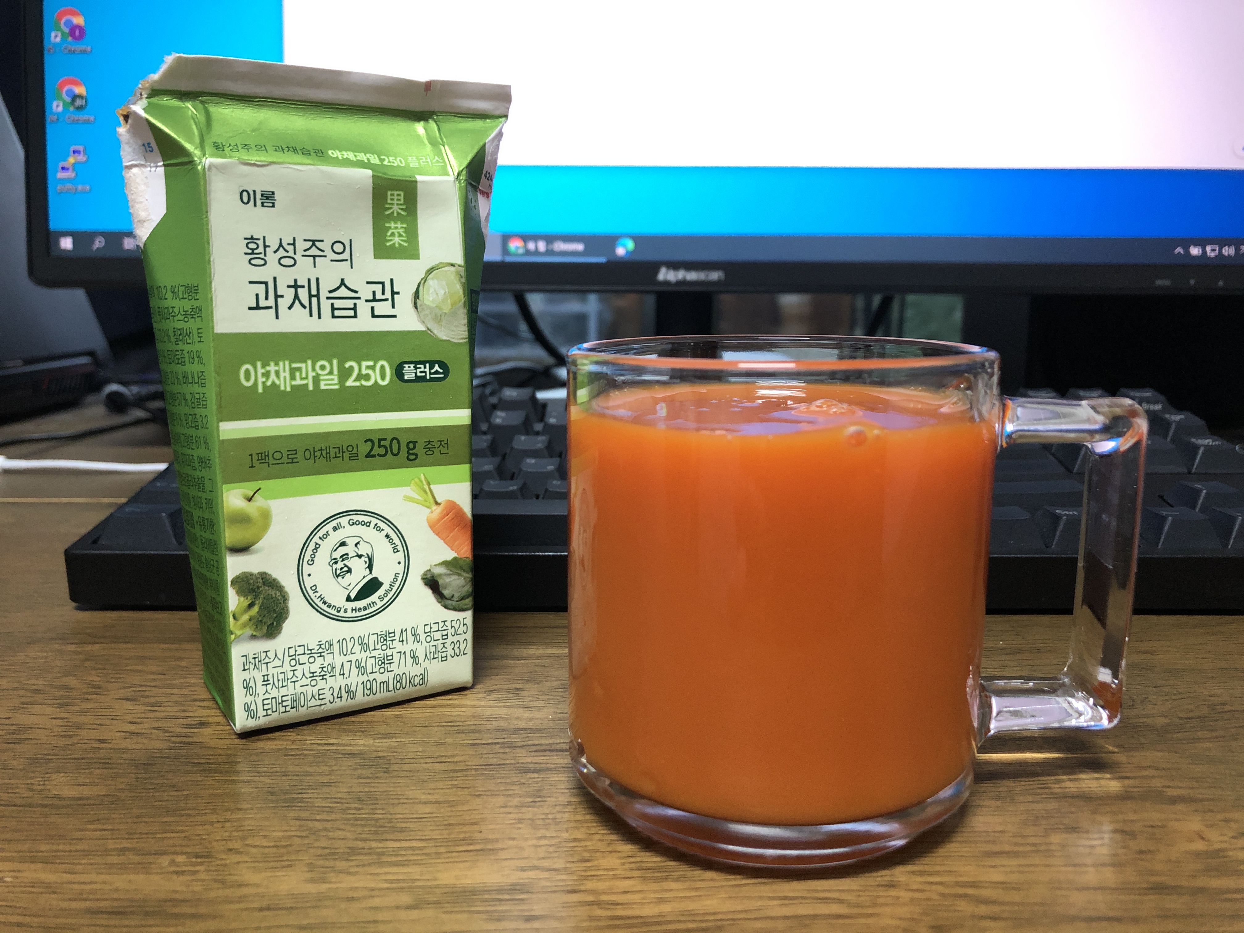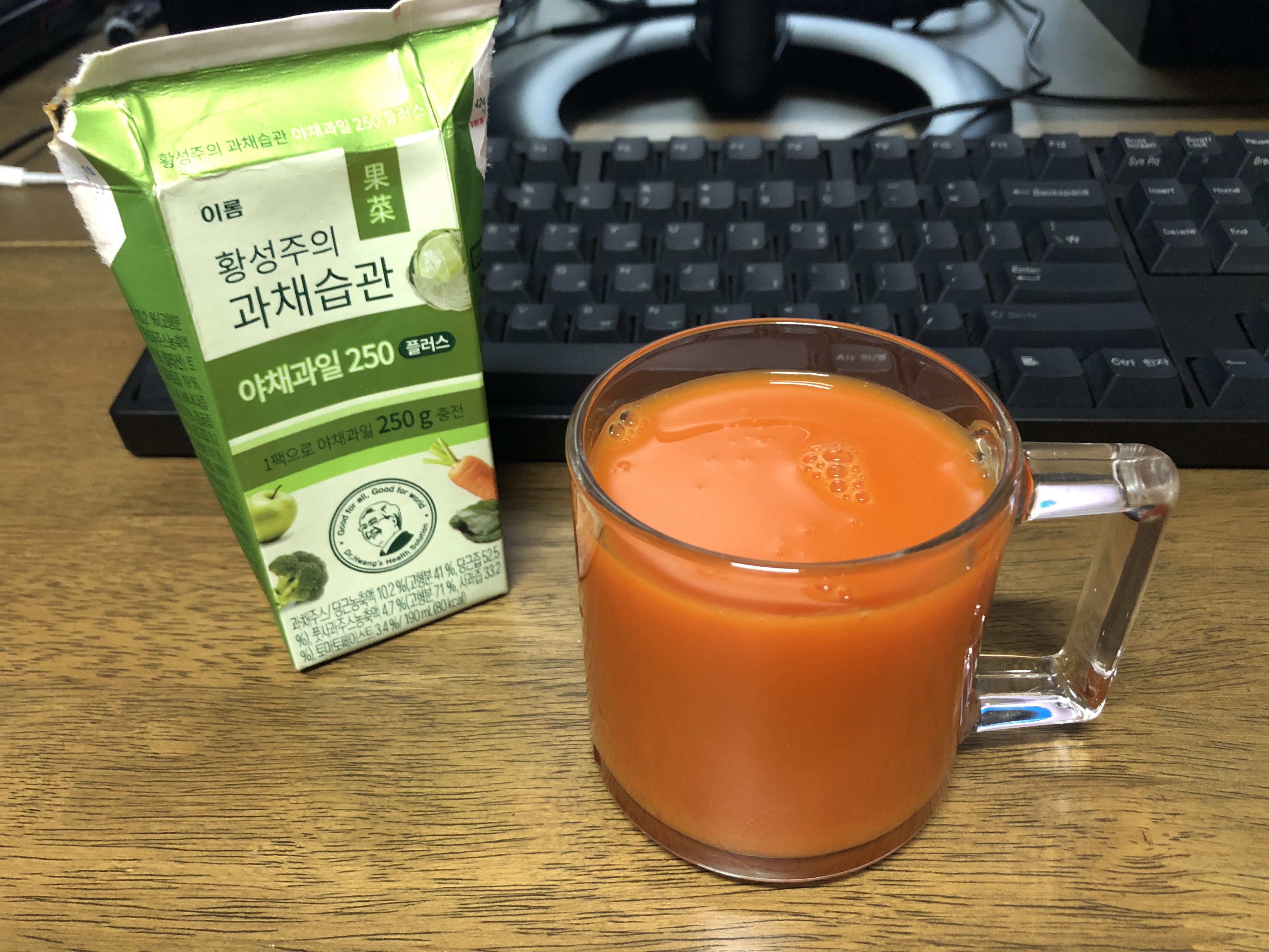 황성주의 과채습관 야채과일 250 플러스. 토마토 주스라고 말해도 될 만큼 토마토의 맛이 강합니다. 다른 야채가 많이 든 것보다는 맛이 좋아서 토마토를 많이 넣은 것 같습니다. 아이들에게 한 모금을 주니 역시나 싫어하네요. 몸에 좋다고 먹이는데 남은 건 그냥 제가 마십니다. 그래서 결론: 몸에 좋은 주스지만 먹을만하다. 하지만 아이들은 싫어할 듯.