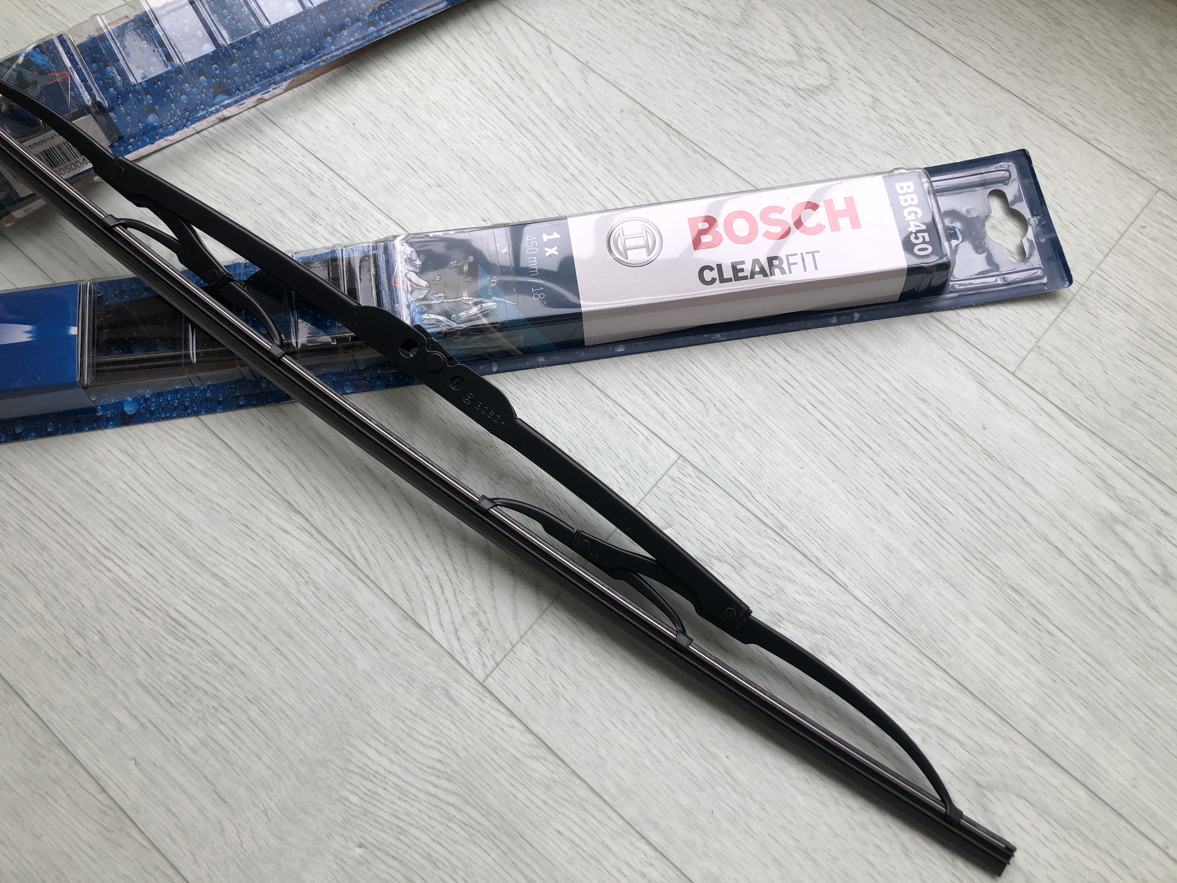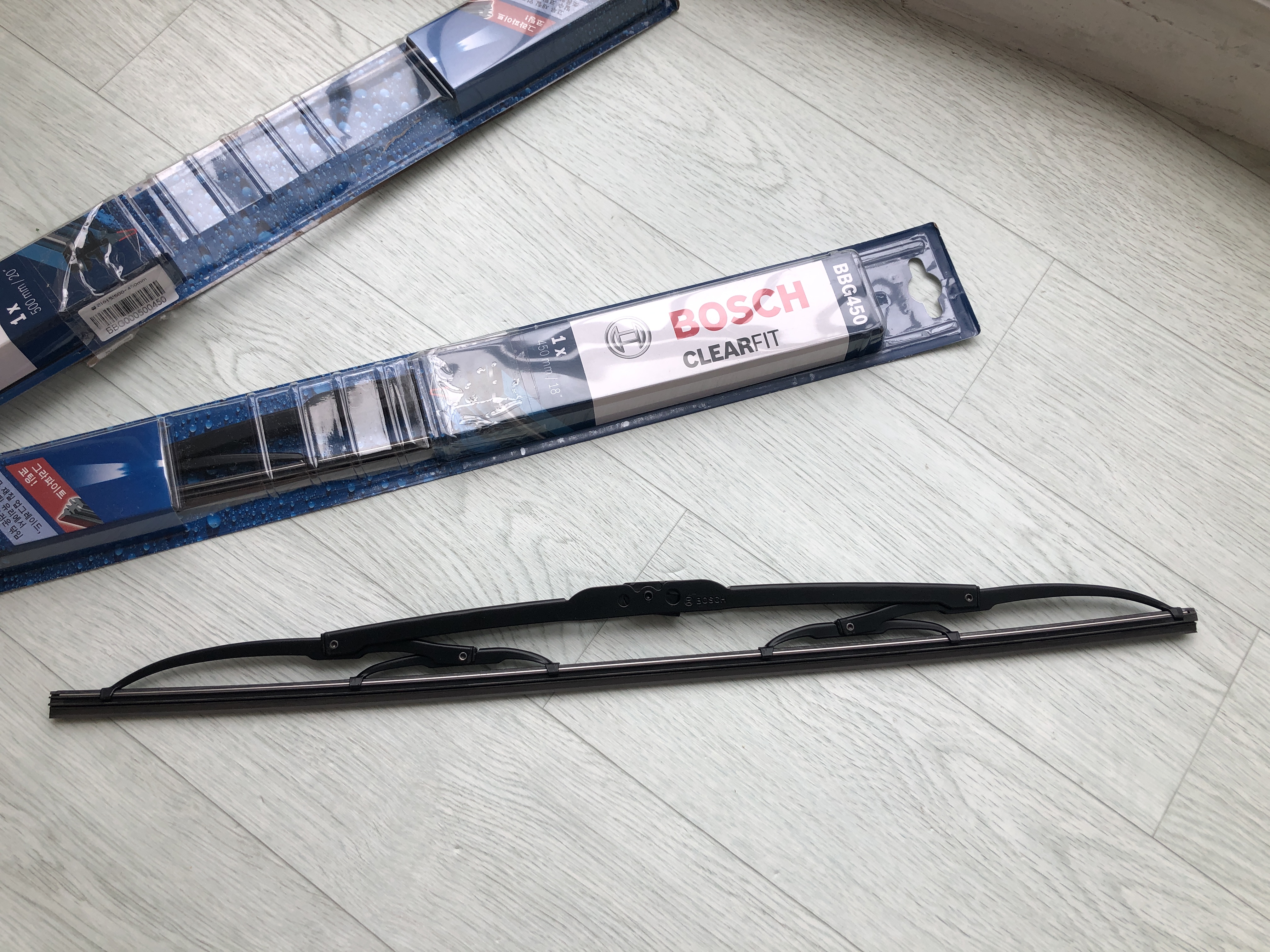 보쉬 클리어핏 제품 위에 보면 BBG450, BBG500이라는 모델명을 볼 수 있는데 이건 와이퍼의 길이를 말합니다. 밑에 보면 450mm/18", 500mm/20"와 같이 수치가 표시된 것을 볼 수 있습니다.