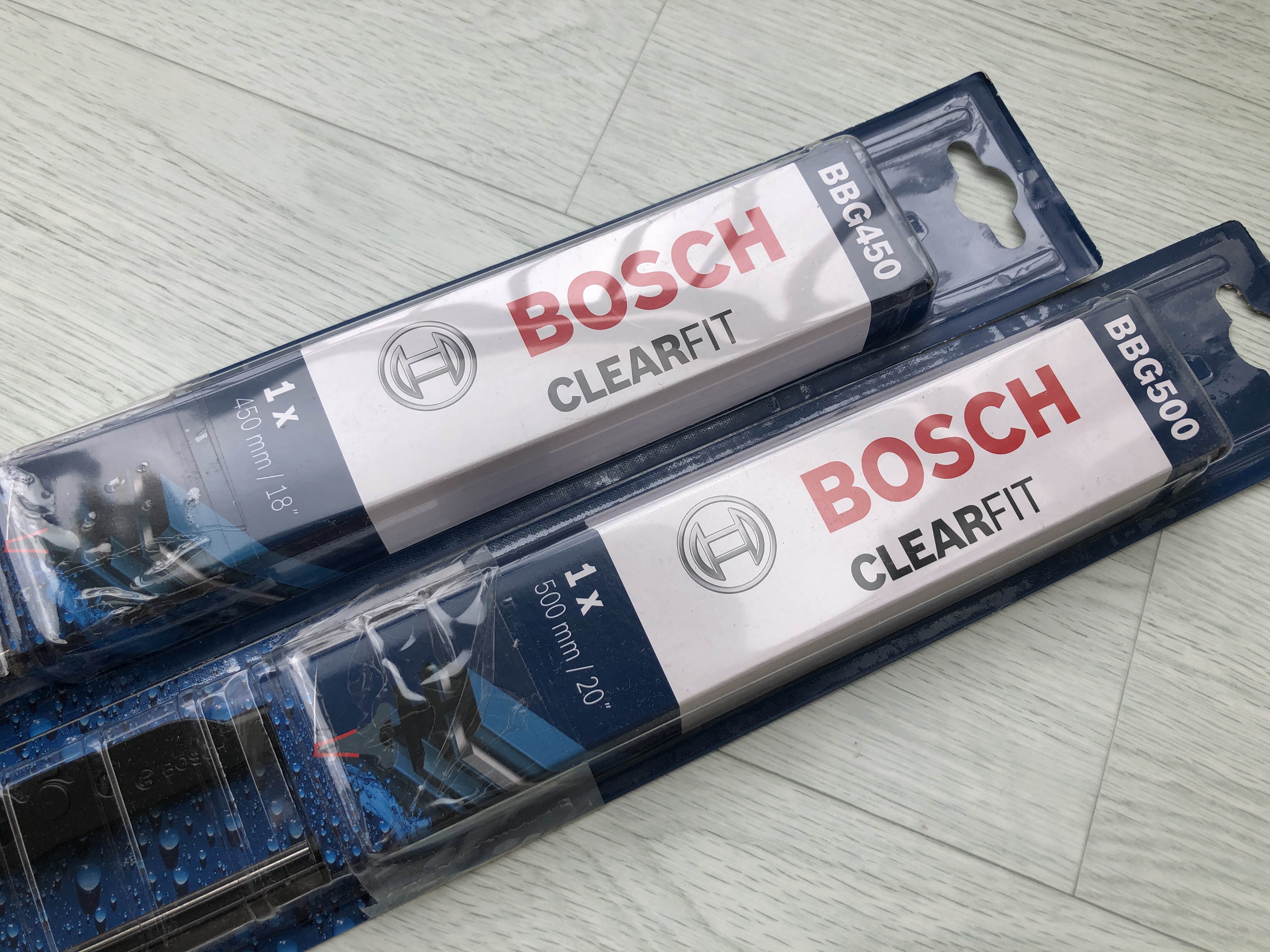 보쉬 클리어핏 제품 위에 보면 BBG450, BBG500이라는 모델명을 볼 수 있는데 이건 와이퍼의 길이를 말합니다. 밑에 보면 450mm/18", 500mm/20"와 같이 수치가 표시된 것을 볼 수 있습니다.