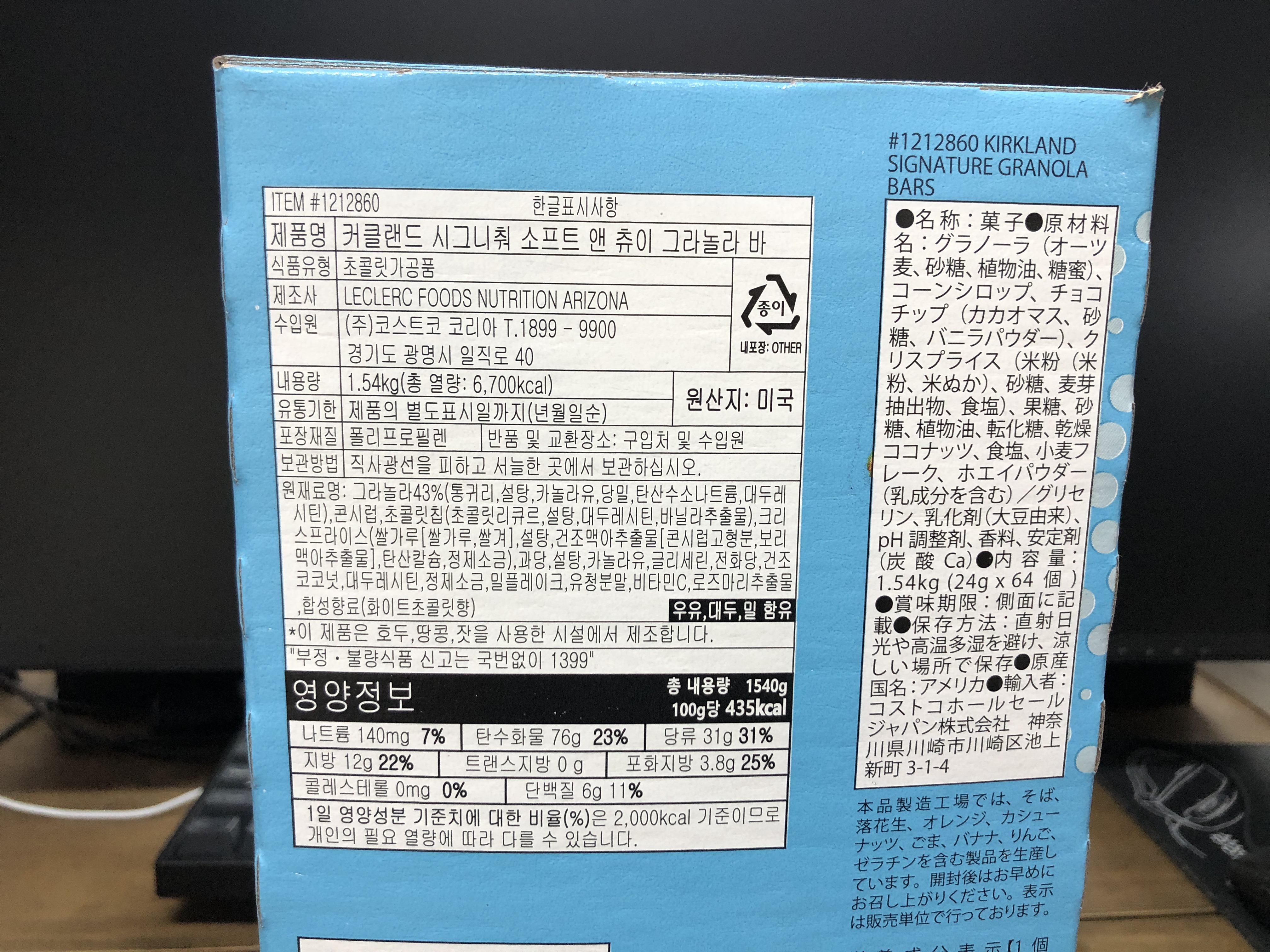 정확한 제품명은 '코스트코 커클랜드 시그니춰 소프트 앤 츄이 그라놀라 바'. 원재료명에 우유가 들어있는데 아주 소량만 들어있는지 우유 알레르기가 있는 아이가 먹어도 큰 탈이 없었습니다. 그래도 혹시나 모르니 알러지가 있다면 조심해서 먹이세요.