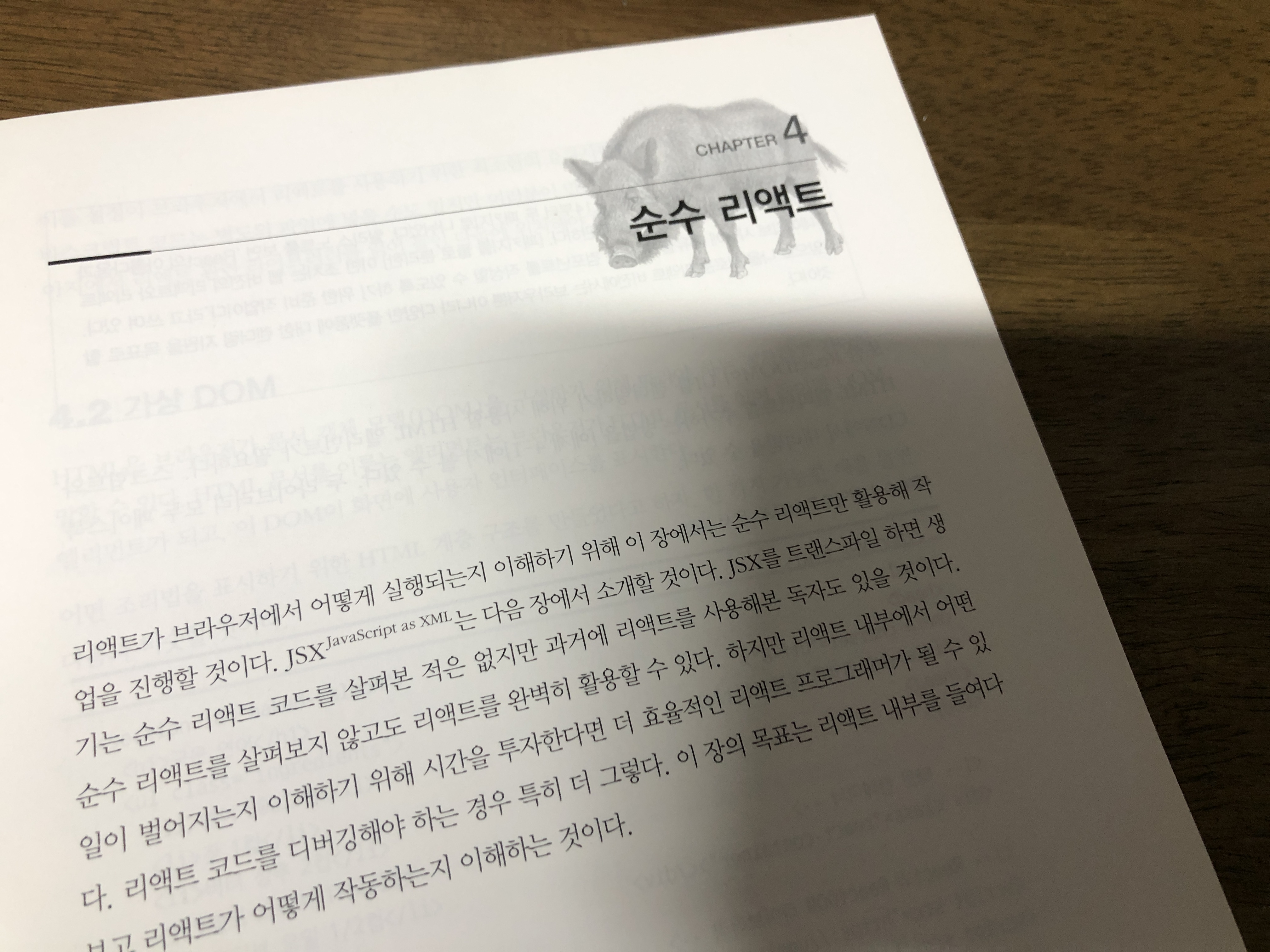 자바스크립트, 함수형 프로그래밍까지 배우고 나면 본격적으로 리액트를 배웁니다. 챕터4 순수 리액트에서는 꼭 알아야 하는 내용은 아니지만 알면 좋은 리액트 내부를 배울 수 있습니다. 뭐든 잘하는 게 어렵습니다. 리액트를 좀 더 자세히 알고 싶으면 정독하세요. 챕터5부터는 실질적으로 리액트를 사용하는데 그 시작은 JSX. JSX로 좀 더 쉽게 리액트 개발을 할 수 있습니다.