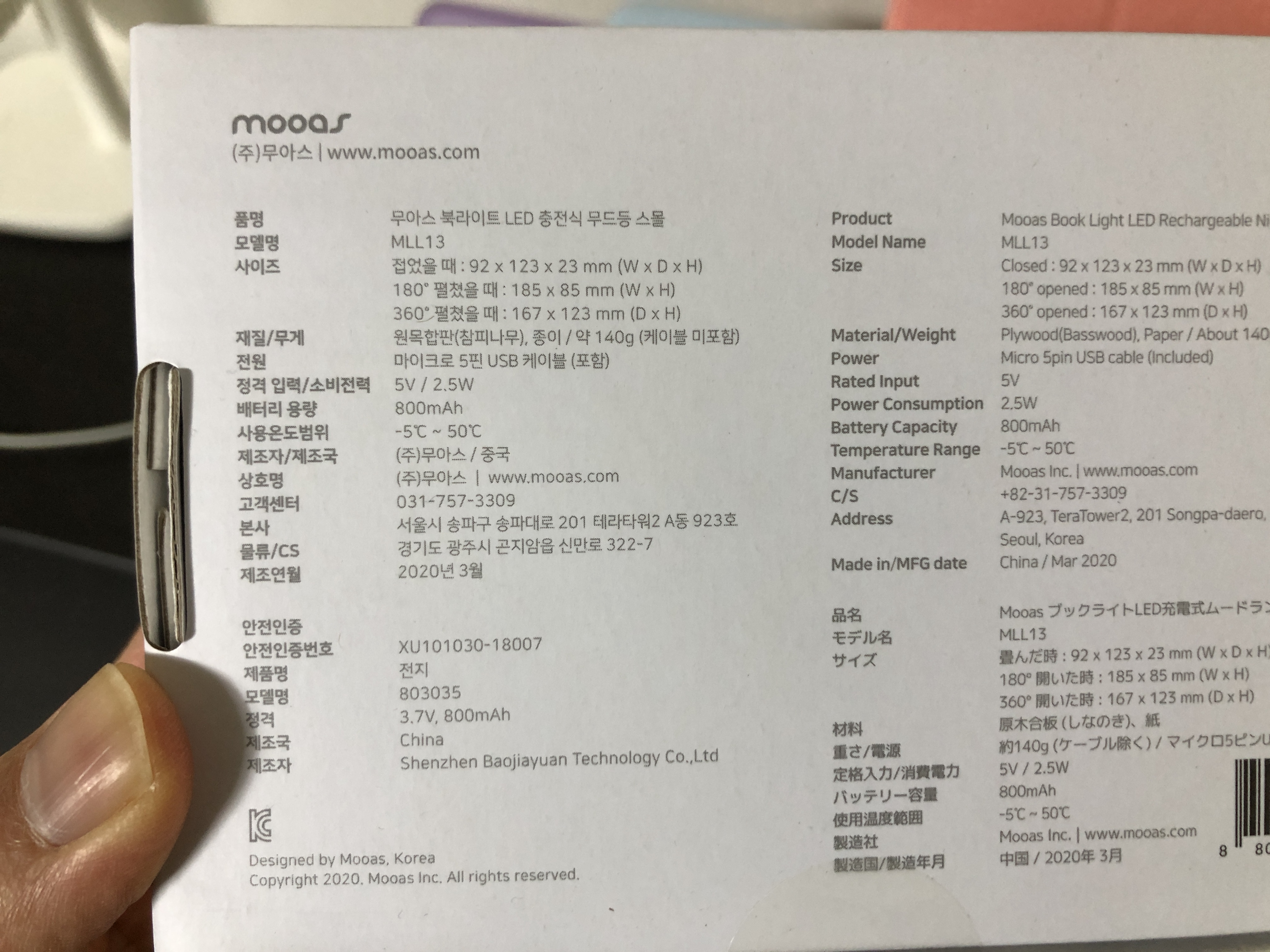 무아스 북라이트 LED 충전식 무드등 펼친 모습