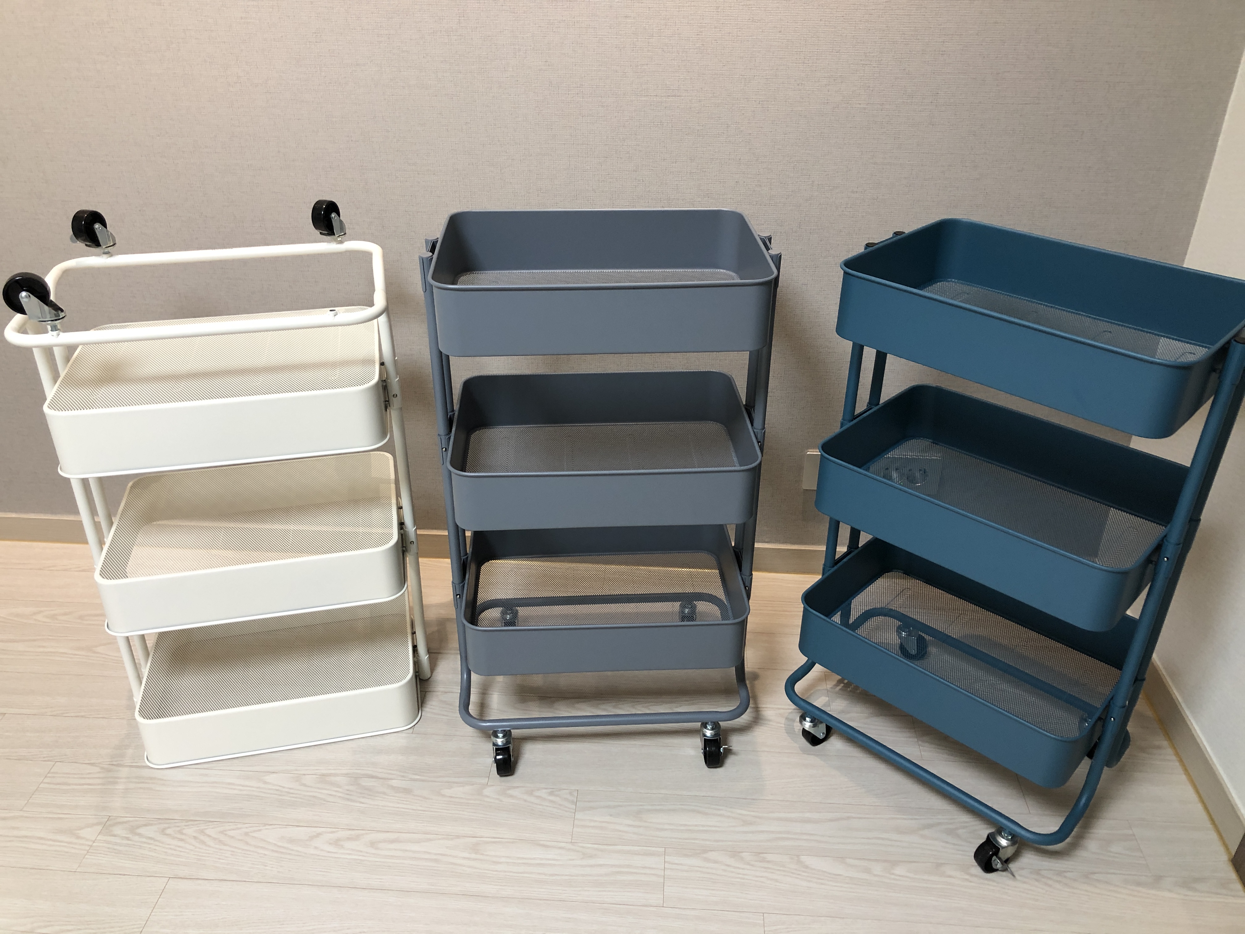 홈플러스 시그니처 이동식 트롤리 3단. 색상은 순서대로 아이보리, 그레이, 블루. 아이당 하나씩 3개 구매한 제품입니다. 거실에 밀고 나와 자기 물건을 담아서 돌아가는 모습을 보면 뿌듯합니다. 트롤리는 거실, 방 정리에 딱 필요한 제품이 아닐까 싶네요. 마음에 드는 제품입니다.