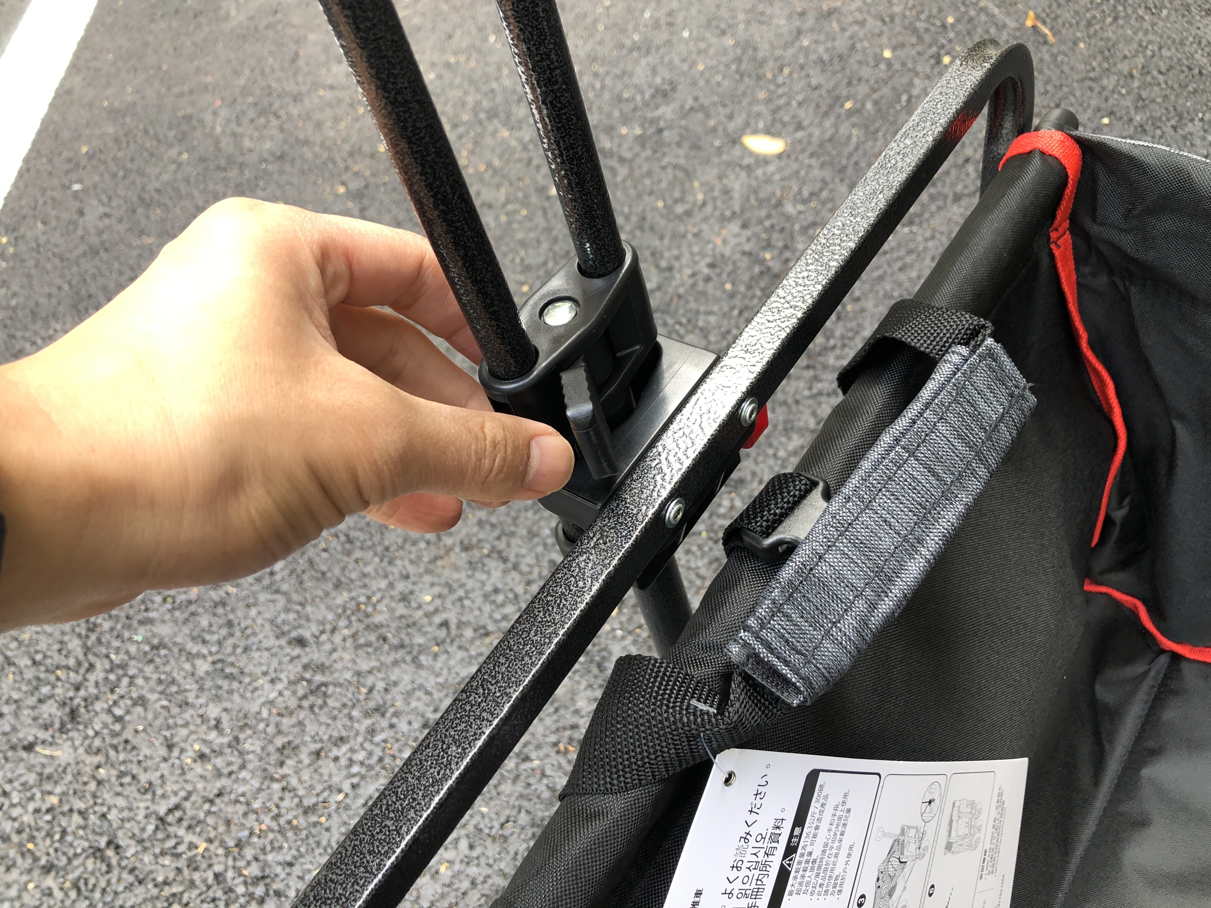 이걸로 수레 손잡이를 고정할 수 있습니다. 아주 단단하게 고정되는 것은 아니고 그냥 살짝 잡아주는 느낌이라 힘을 주고 손잡이를 내리고 올릴 수 있습니다.