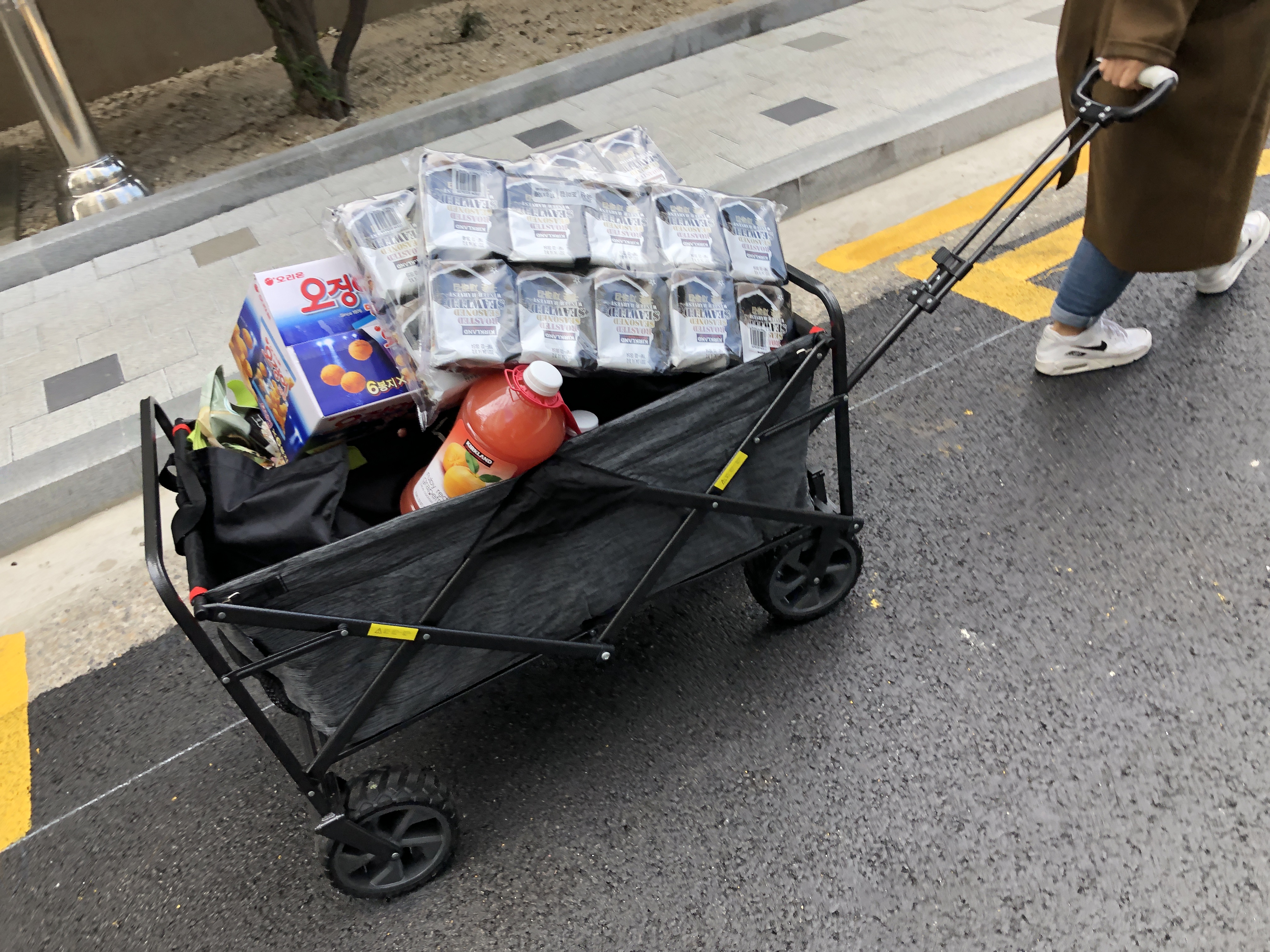 접이식 손수레를 큰 걸로 사서 그런지 생각보다 물건이 많이 실리네요. 보고 있으니 뿌듯합니다.