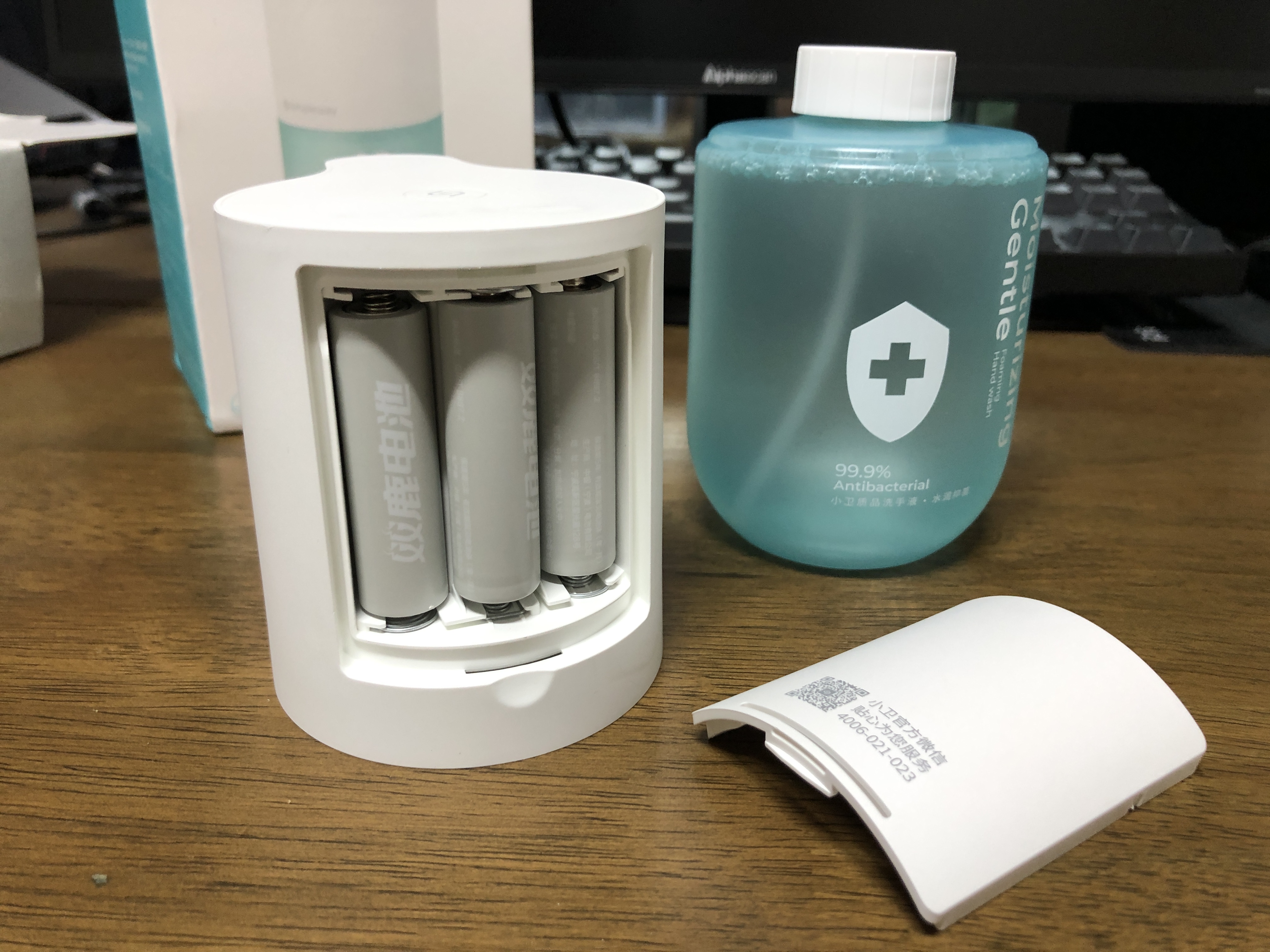 샤오미 simpleway 자동 손세정기에 배터리를 넣은 모습