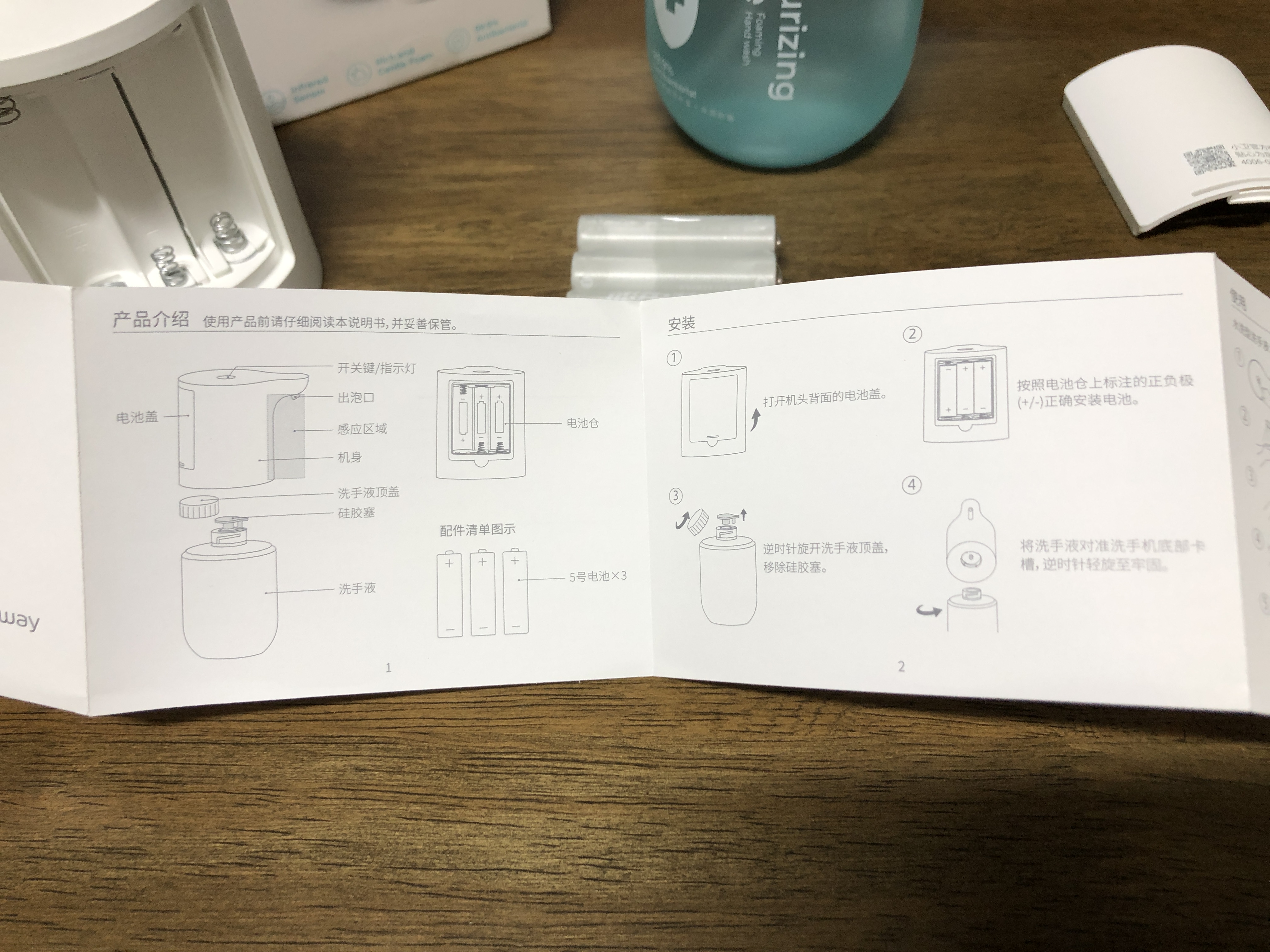 박스에 적힌 한자나 중국어를 몰라서 그냥 바로 개봉했습니다. 제품 구성은 사진에 보이다시피 제품 본체와 핸드워시가 담긴 통 그리고 건전기, 설명서가 전부입니다.