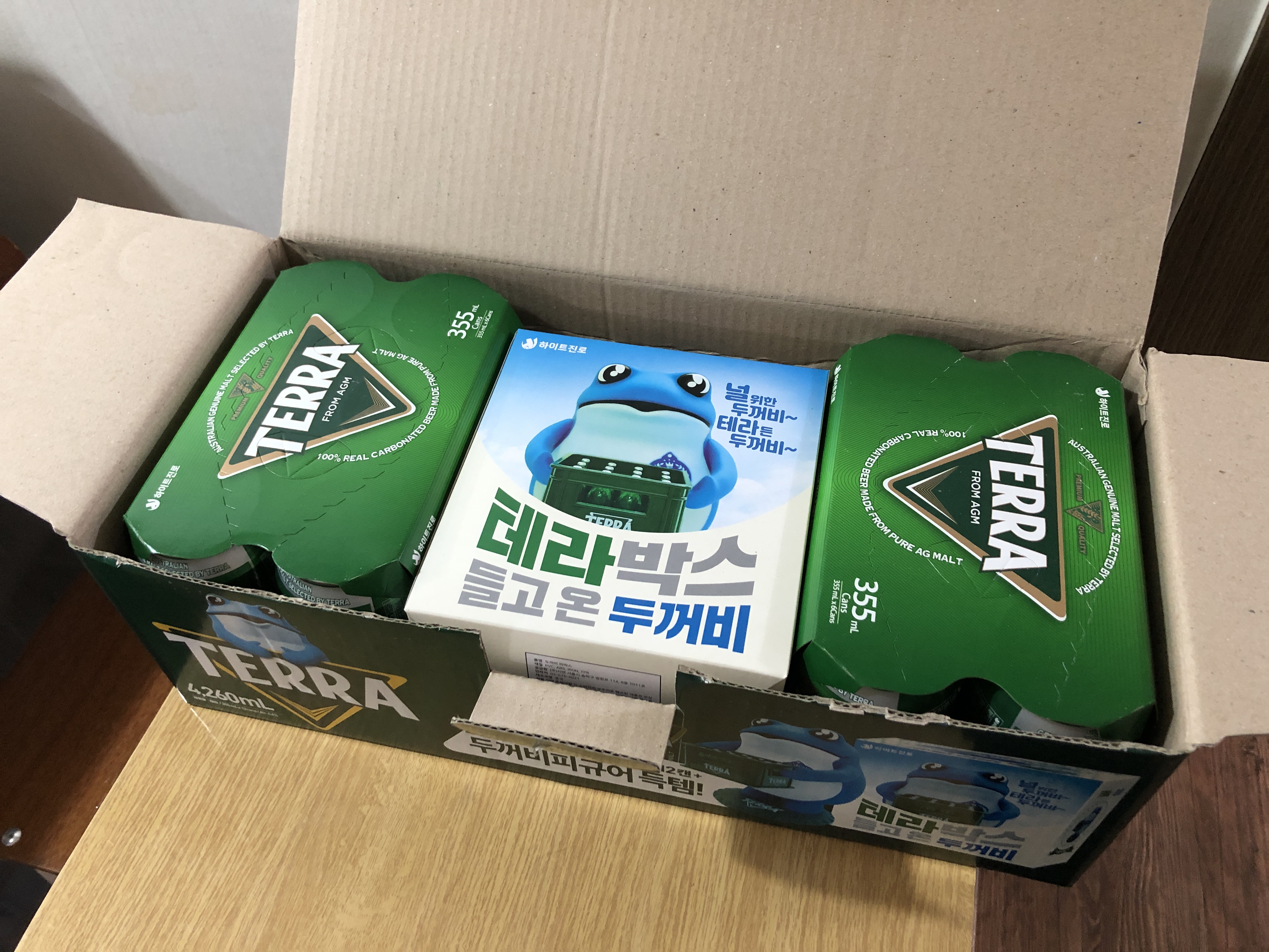 열어보면 355ml 테라 맥주 12캔과 두꺼비 피규어가 들어있습니다.