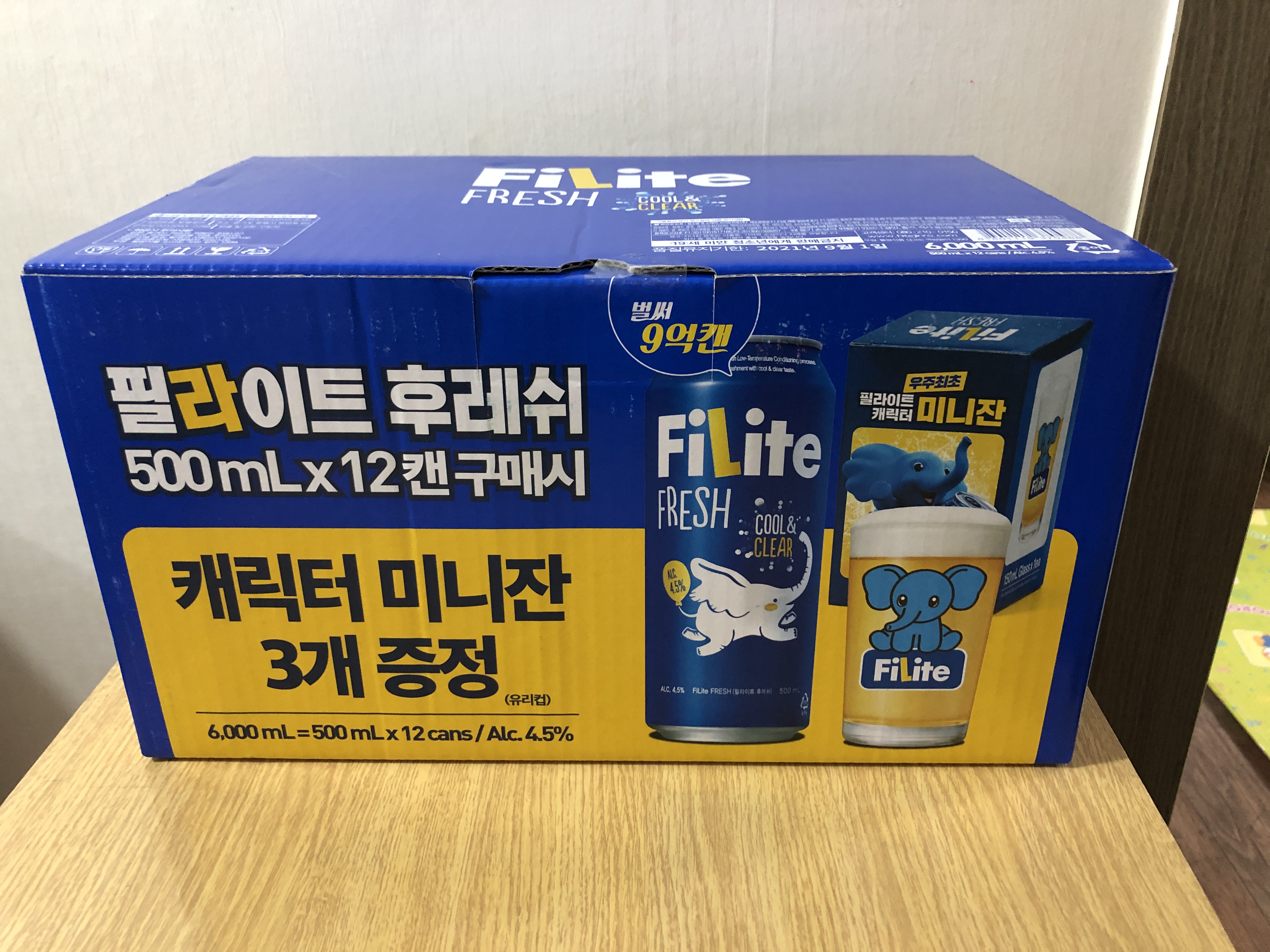 저렴한 맛에 부담 없이 즐기는 술(맥주?!) 필라이트 FiLite. 식품유형이 맥주가 아니고 기타주류라 저렴하게 즐길 수 있는데 맛을 보면 제법 맥주스럽습니다. 자주 마시는 술은 아닌데 이번에 코끼리 캐릭터 미니잔을 준다고 해서 홈플러스에서 한번 사봤습니다.