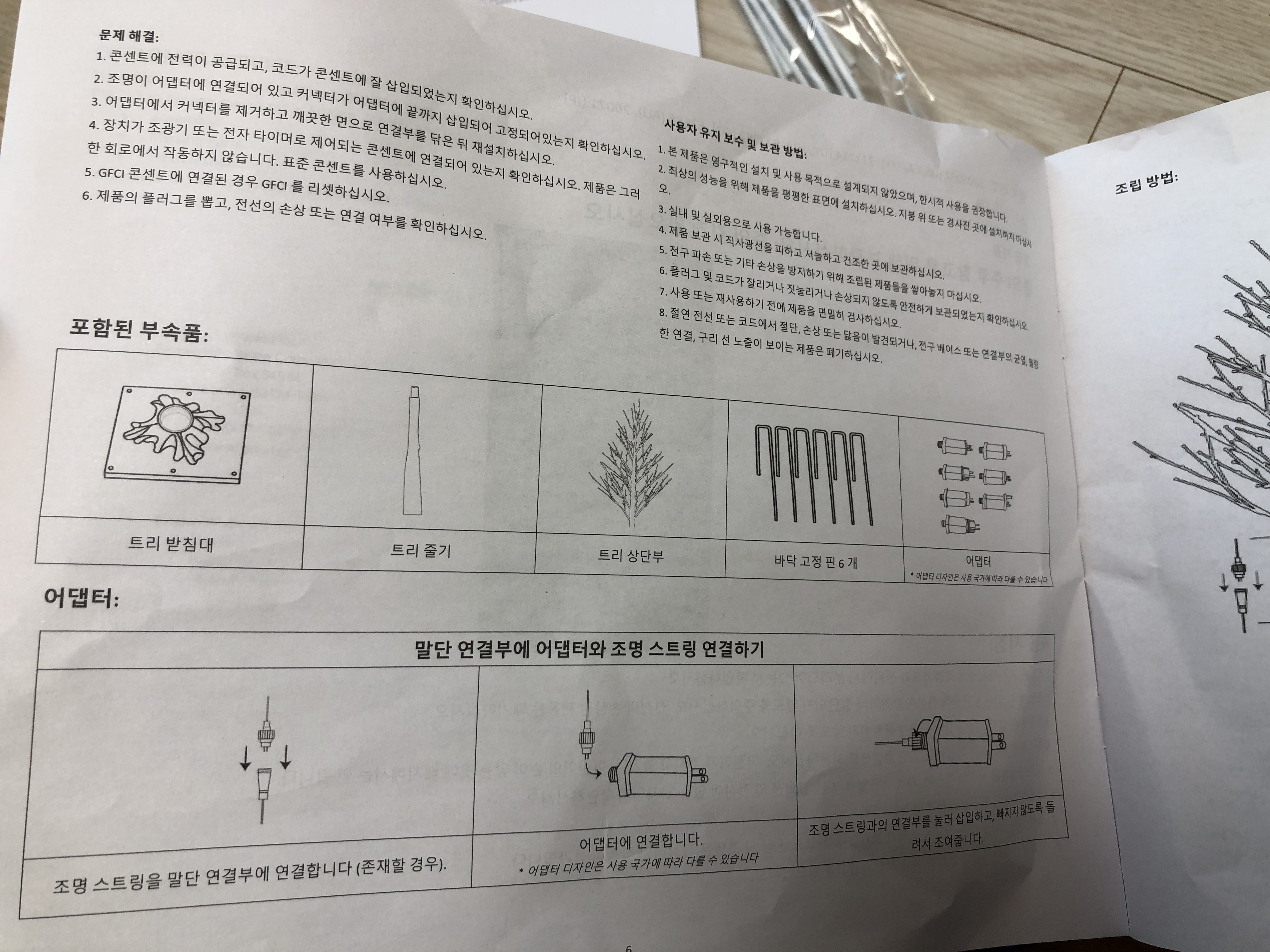 포함된 부속품은 트리 받침대, 트리 줄기, 트리 상단부, 바닥 고정 핀 6개, 어댑터