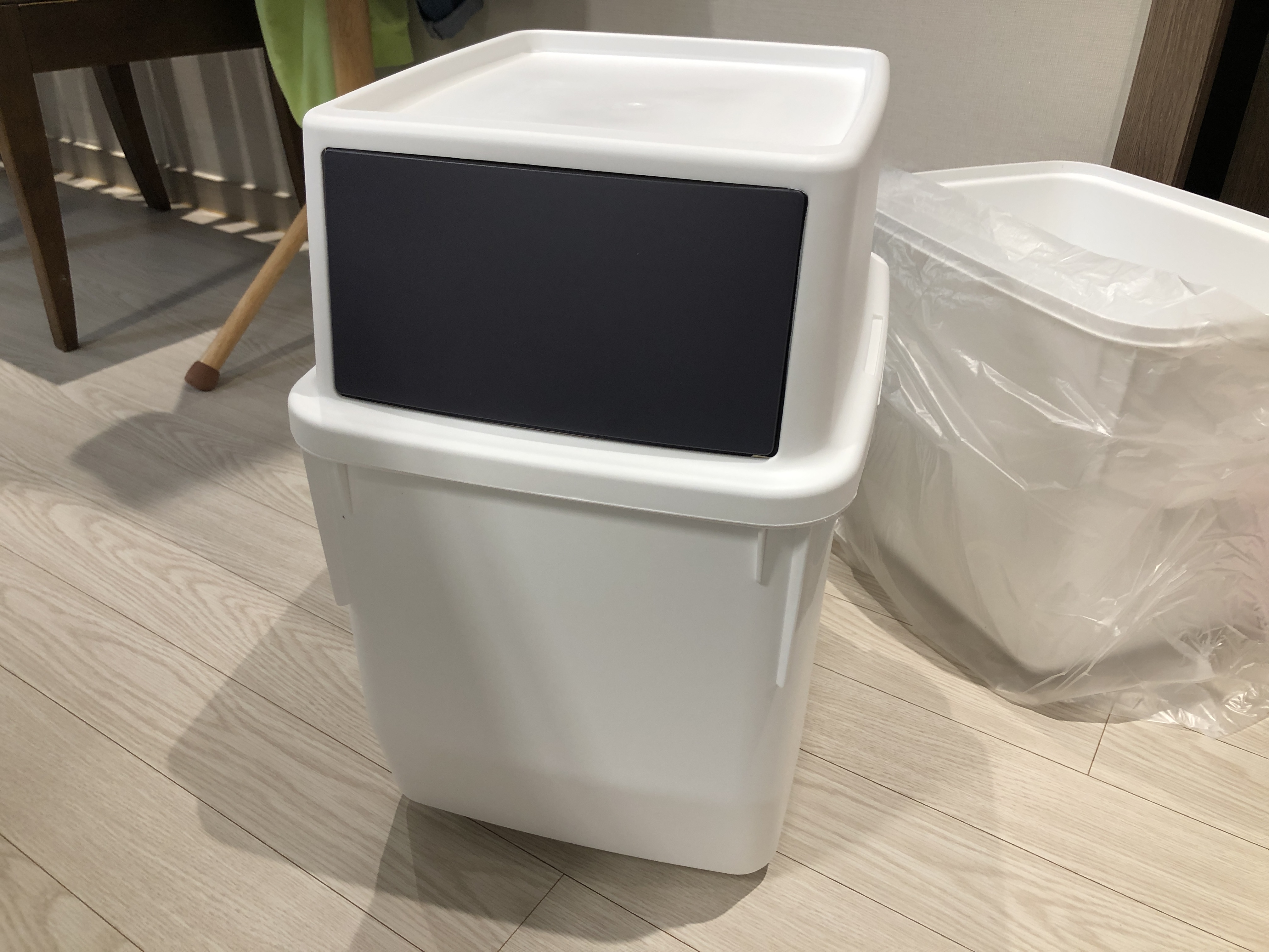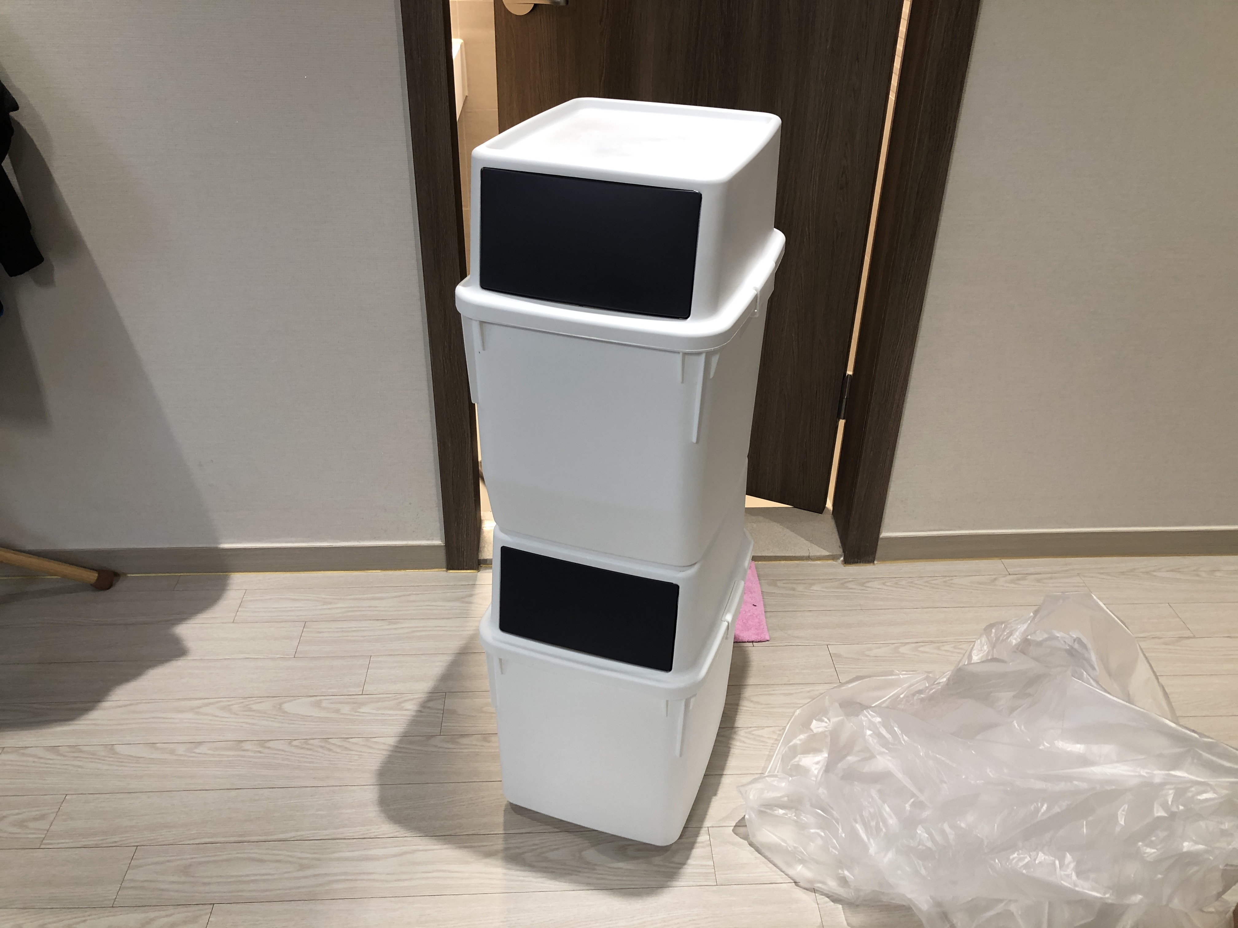 분리수거함을 조립한 모습입니다. 딱 깔끔 그 자체네요. 이 심플한 스타일이 마음에 들어 이 엔플라스틱 제품을 선택했습니다. 색상은 화이트 말고 블랙도 있으니 참고하세요.