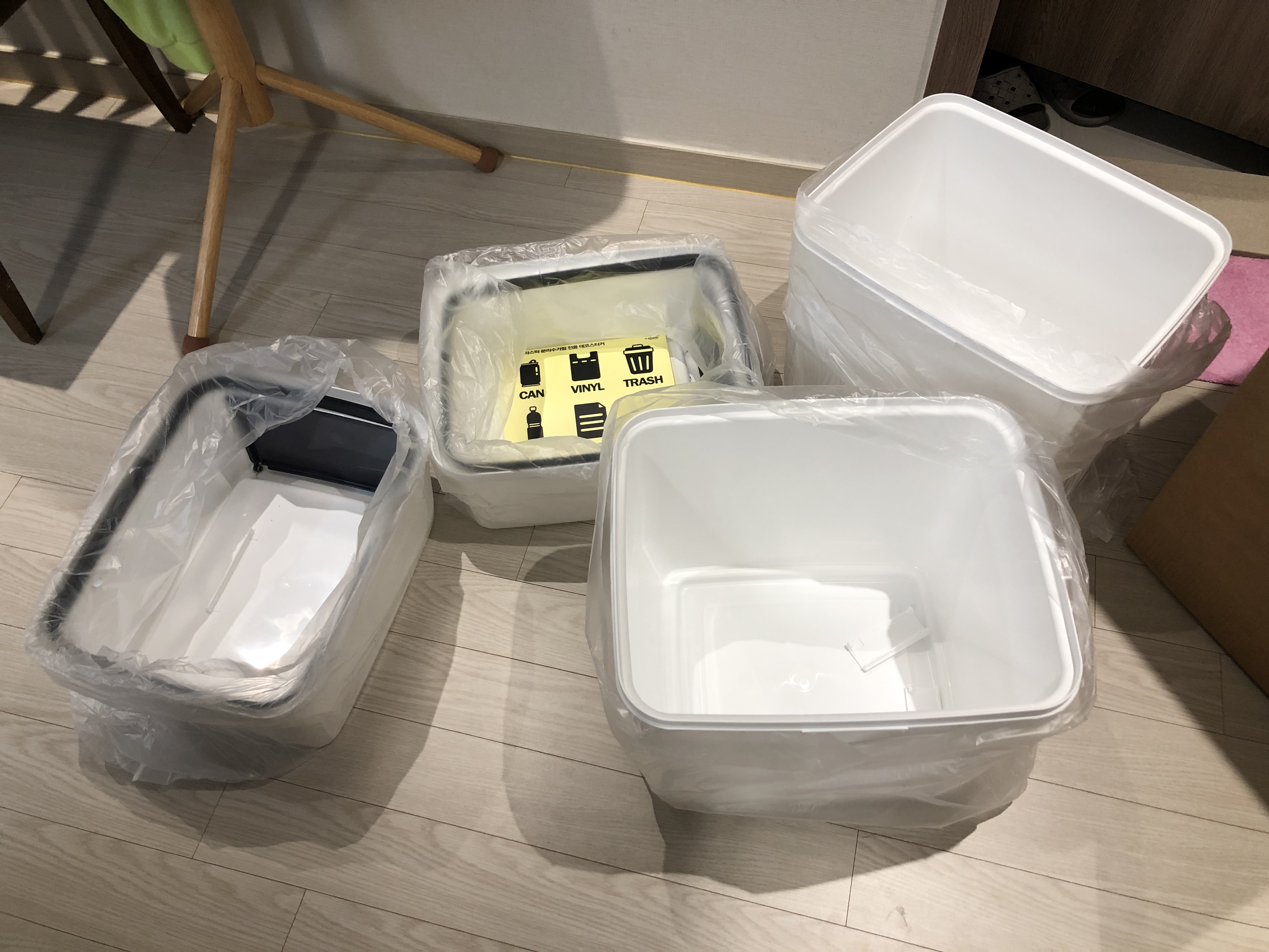 재활용 분리수거에 그냥 굴러다니는 봉지, 택배 박스(상자)를 이용했는데 아무래도 좀 지저분한 것 같아 분리수거함을 구매했습니다. 제가 산 제품은 엔플라스틱 NEW 컬러빈 화이트 분리수거함인데 2개에 20000원 정도 합니다.
