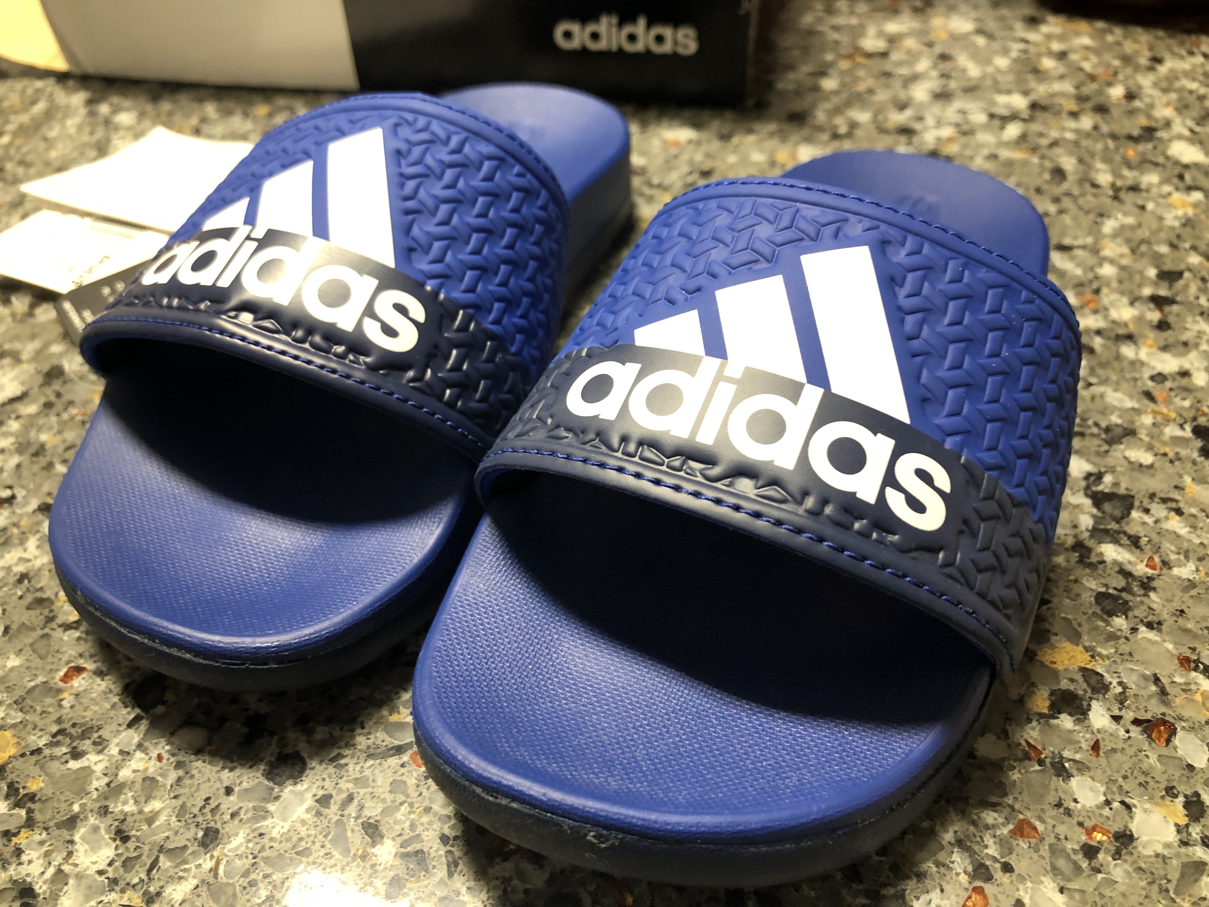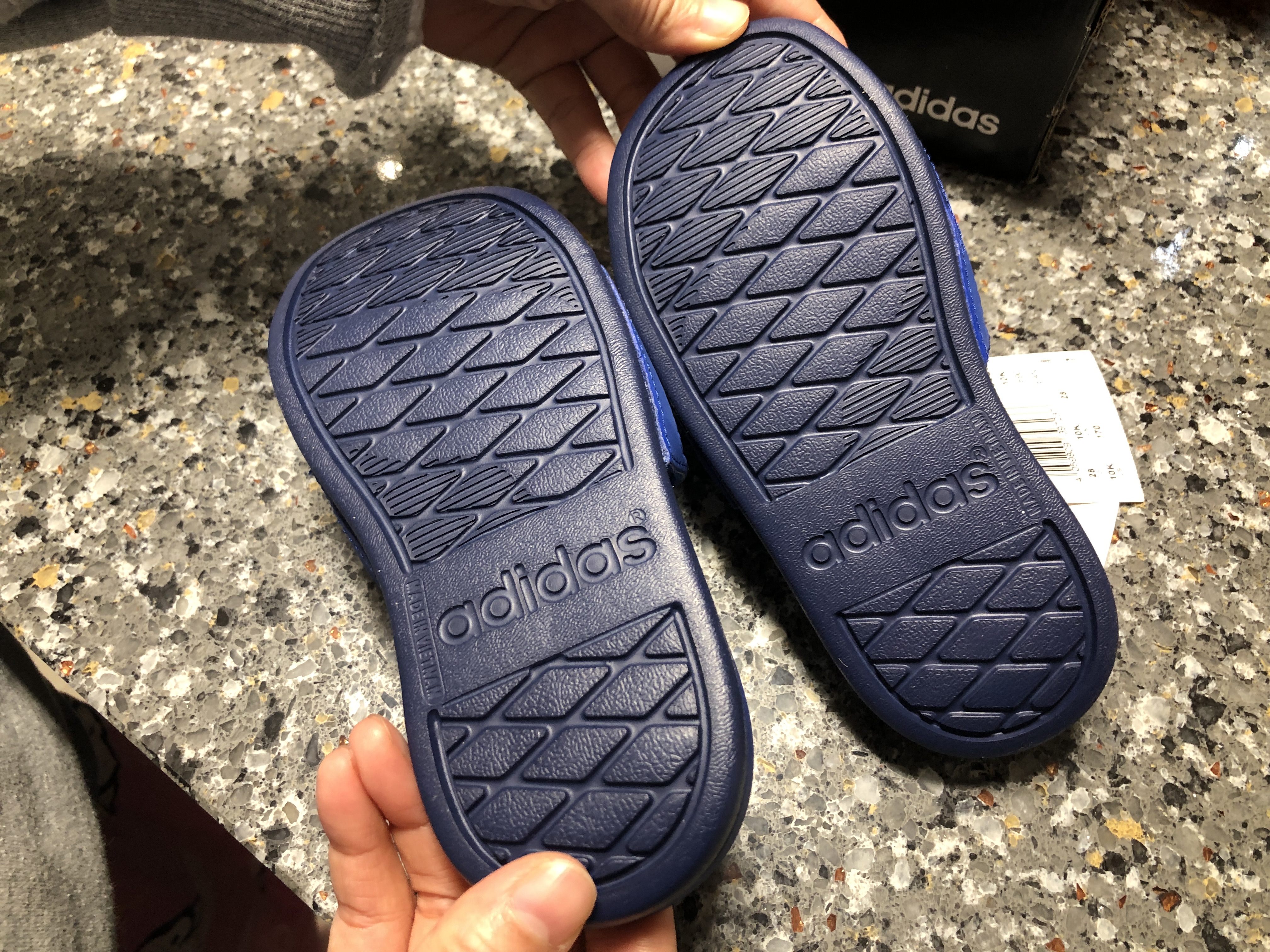 아디다스 키즈 아딜렛 컴포트 슬리퍼 중에서도 작은 170mm 사이즈라 그런지 꺼내는 순간 엄청 귀엽다는 생각을 했습니다. 물론 아디다스라 마감처리도 깔끔합니다.