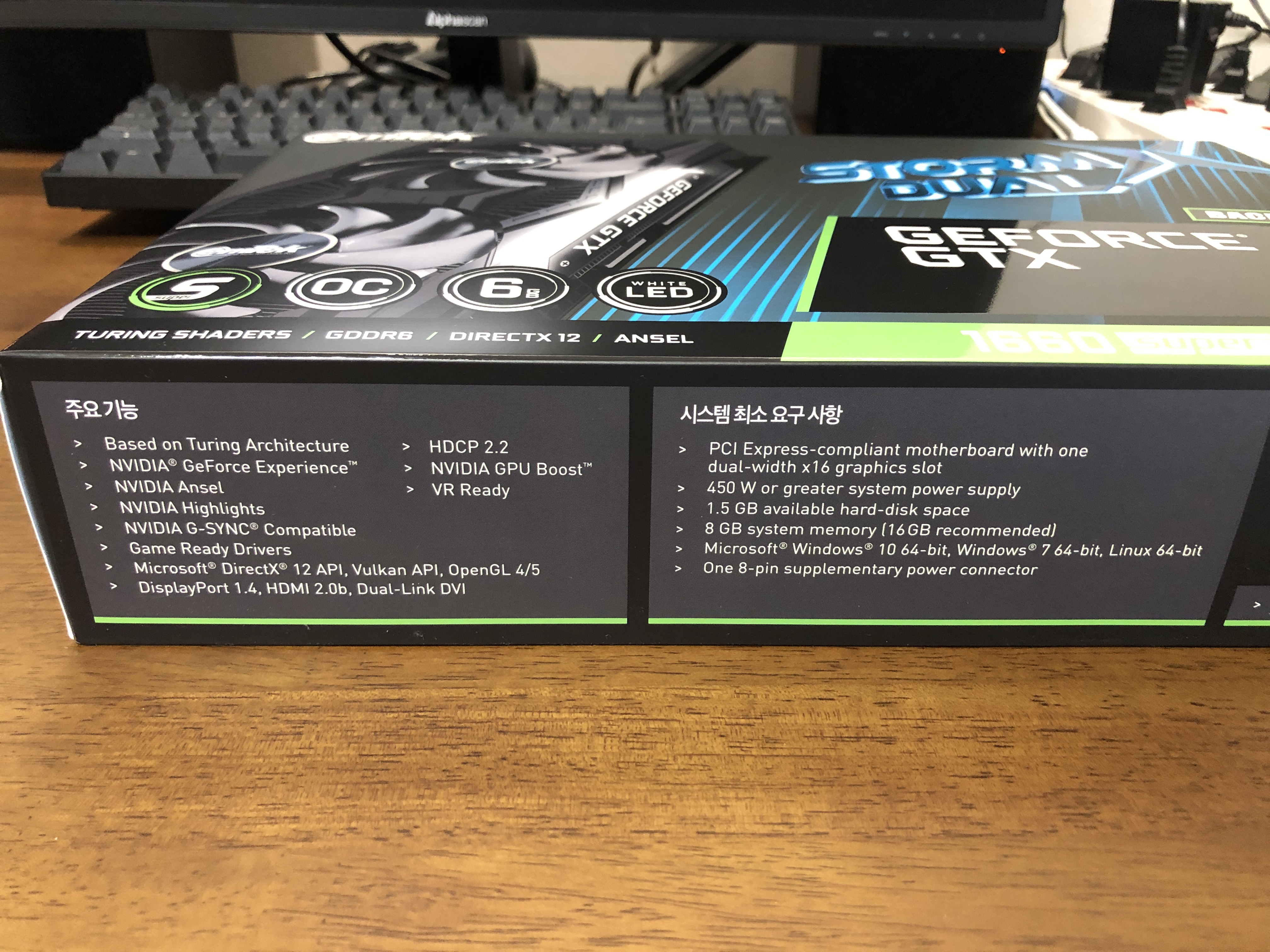 이엠텍 지포스 GTX 1660 SUPER 새 제품을 중고로 구매했습니다. CPU가 라이젠 3200g라 더 좋은 그래픽 카드는 부담스러워 이 제품을 샀습니다. 인터넷으로 검색을 해봐도 3200g에서는 1660 슈퍼가 마지노선이라고 하네요. IT 제품 전문가가 아니라 자세한 이유를 설명할 순 없고 저도 검색에 의지해서 제품을 선택했습니다.