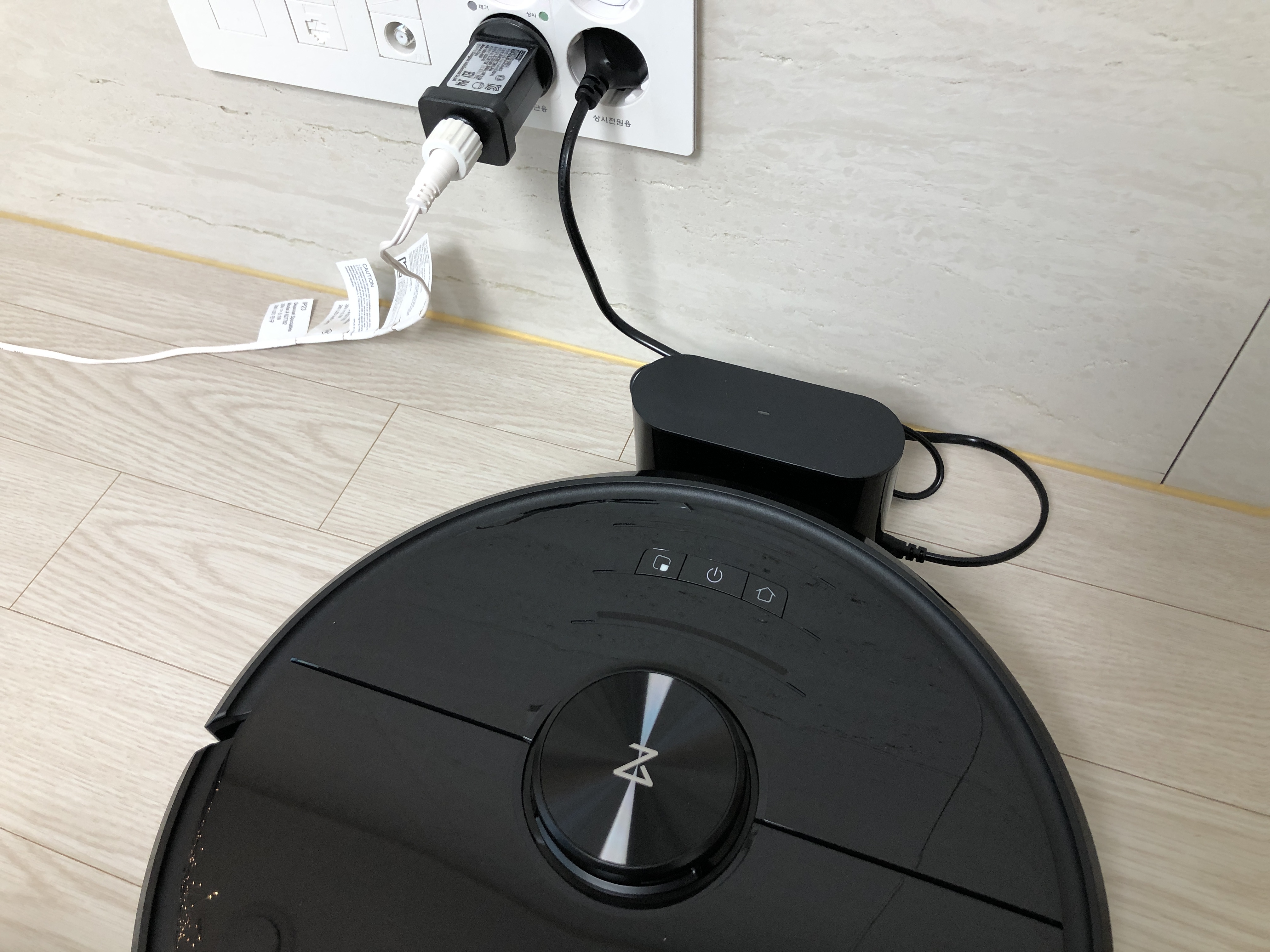 로봇청소기 충전기에 전원을 연결한 모습