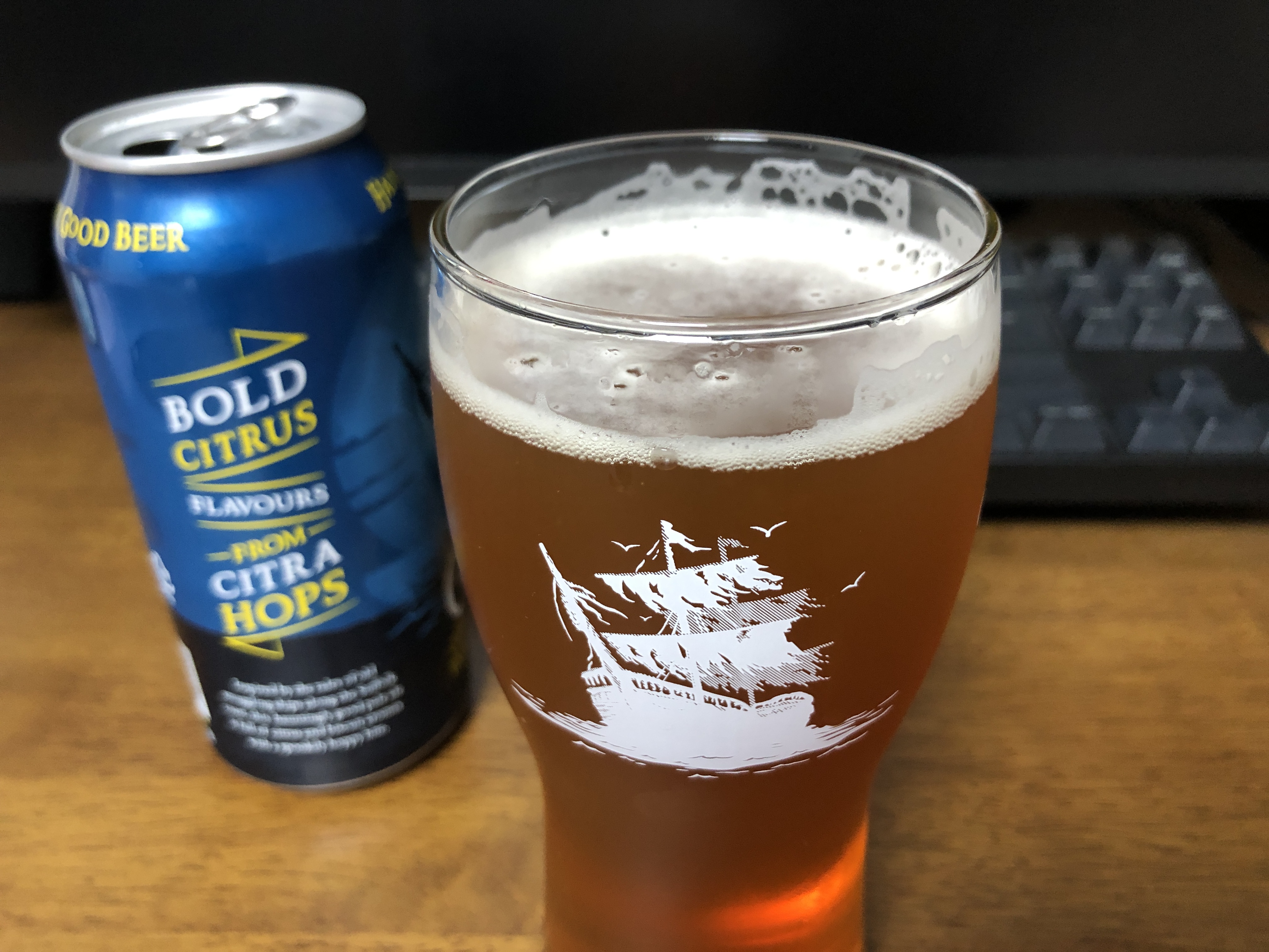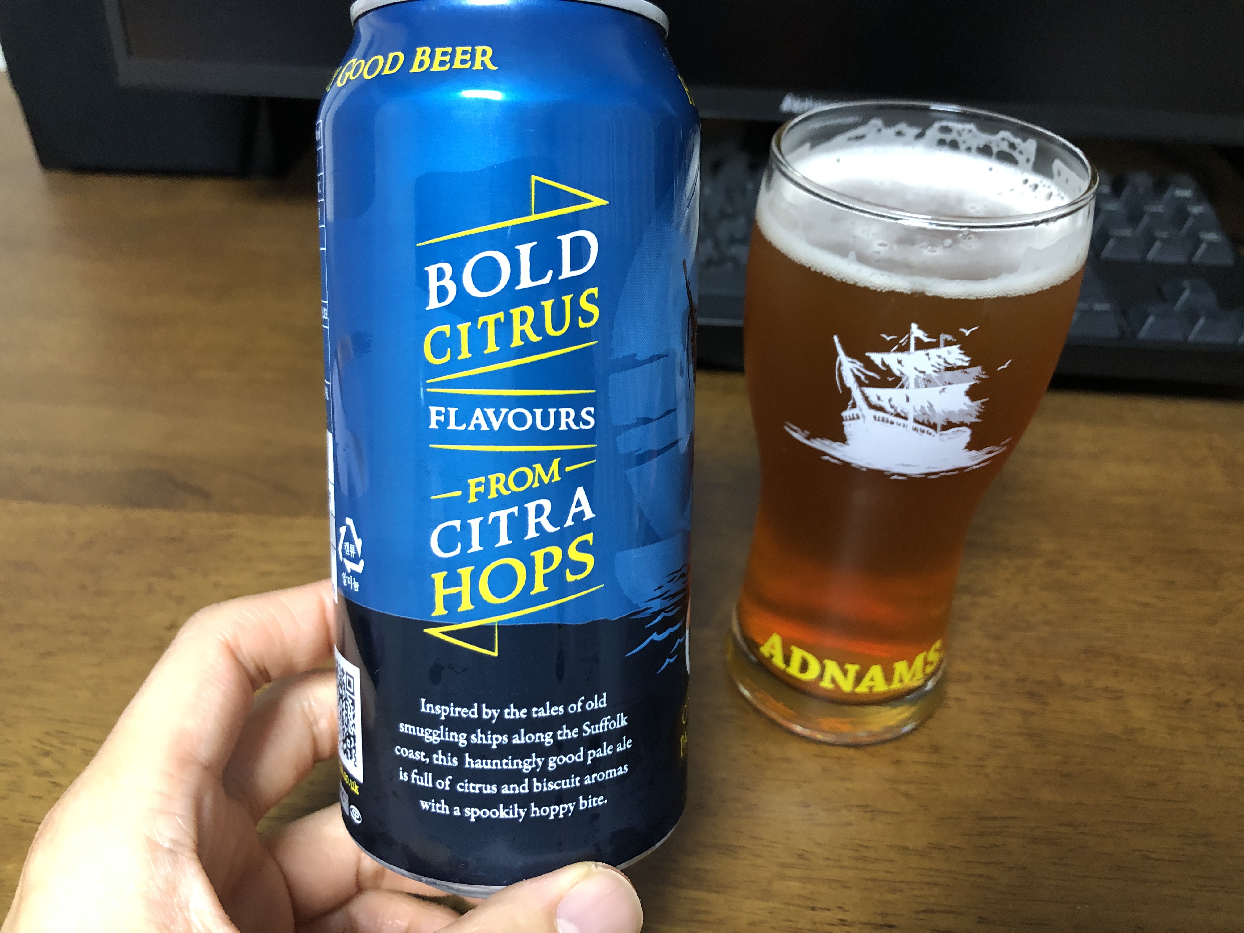 애드남스 고스트쉽(ADNAMS GHOSTSHIP) 맥주의 맛은 페일 에일이라 그런지 IPA와 맛이 비슷합니다. IPA보다는 조금 덜 쓴 느낌인데 향도 괜찮고 전체적으로 밸런스가 잘 잡힌 맥주라 생각합니다. 가끔 새로운 맥주를 마시다 보면 실망도 많이 하는데 이 맥주는 그런 건 아니네요. 먹을만합니다. 전용잔에 따라 한잔 쭈욱 마시니 기분 좋네요.