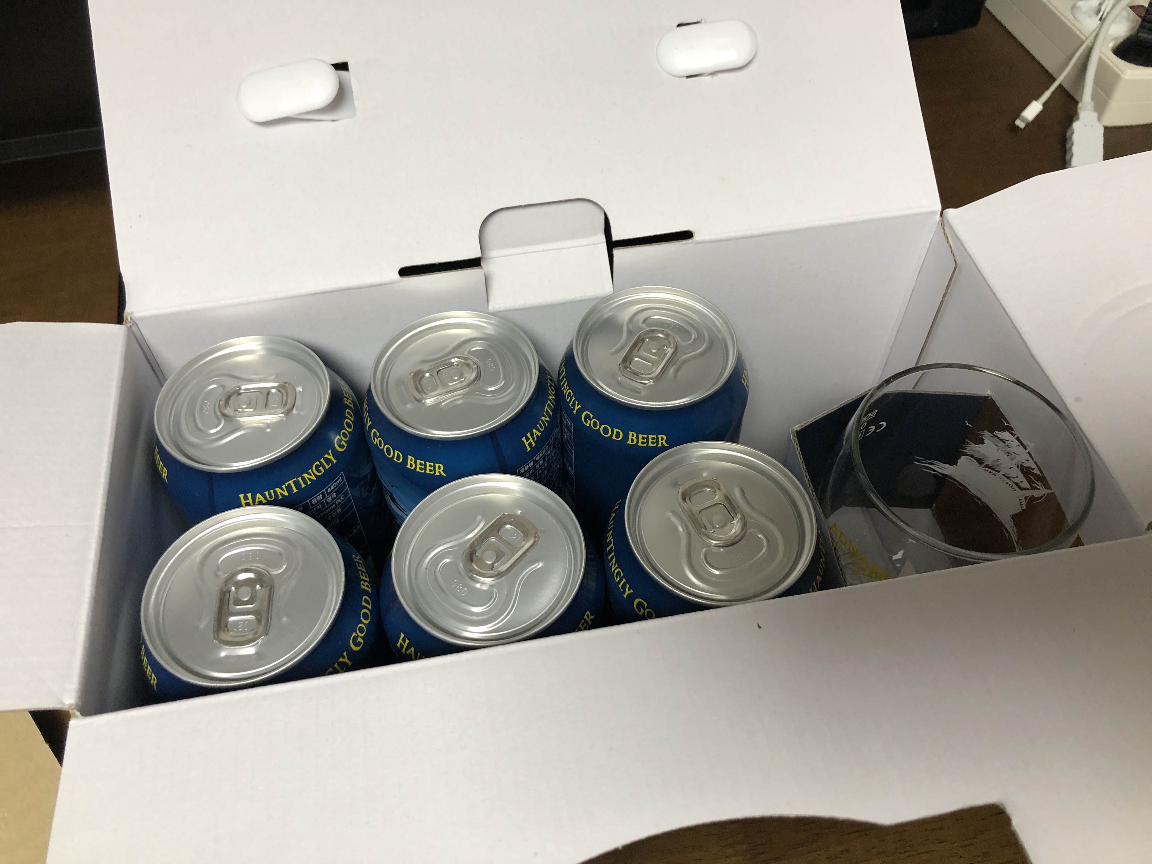 캔 맥주 6개와 전용잔이 들어있습니다.