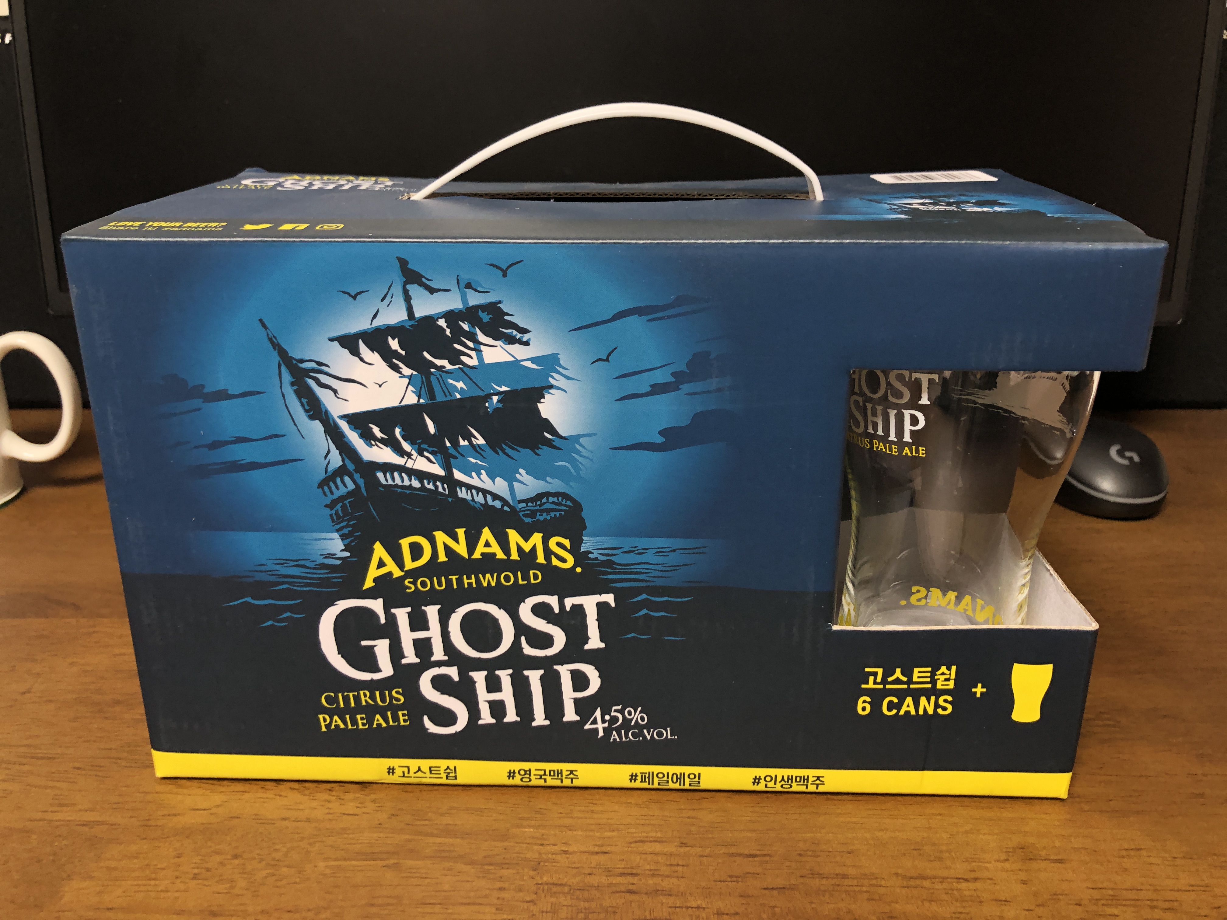 오랜만에 홈플러스에서 맥주 전용잔 세트를 샀습니다. 애드남스 고스트쉽(ADNAMS GHOSTSHIP)이라는 맥주인데 처음 보는 맥주고 잔이 마음에 들어 바로 카트에 담았습니다. 가격은 그냥 일반 수입맥주와 비슷합니다.