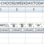 엑셀 CHOOSE함수 사용법 (WEEKDAY함수, TODAY함수와 오늘이 무슨요일인지 알아내기) CHOOSE함수를 사용하는 방법에 대해 알아보겠습니다. IF함수는 조건에 대해 참과 거짓을 나타내는 2가지 경우의 결과만 나타낼 수 있지만 CHOOSE함수는 하나의 입력을 받아 2가지 이상(최대 254개)의 결과를 가질 수 있습니다. CHOOSE(index_num,value1,value2,...) index_num 인수를 사용하여 원하는 값(value1, value2...)을 반환합니다. 만약에 index_num이 1이면 value1, 2면 value2가 선택됩니다. "CHOOSE" 영어 그대로 첫번째 인수를 사용하여 값을 "선택"하는 것입니다. 어떻게 사용하는지 간단한 예를 보겠습니다. 셀에 그냥 아래와 같..